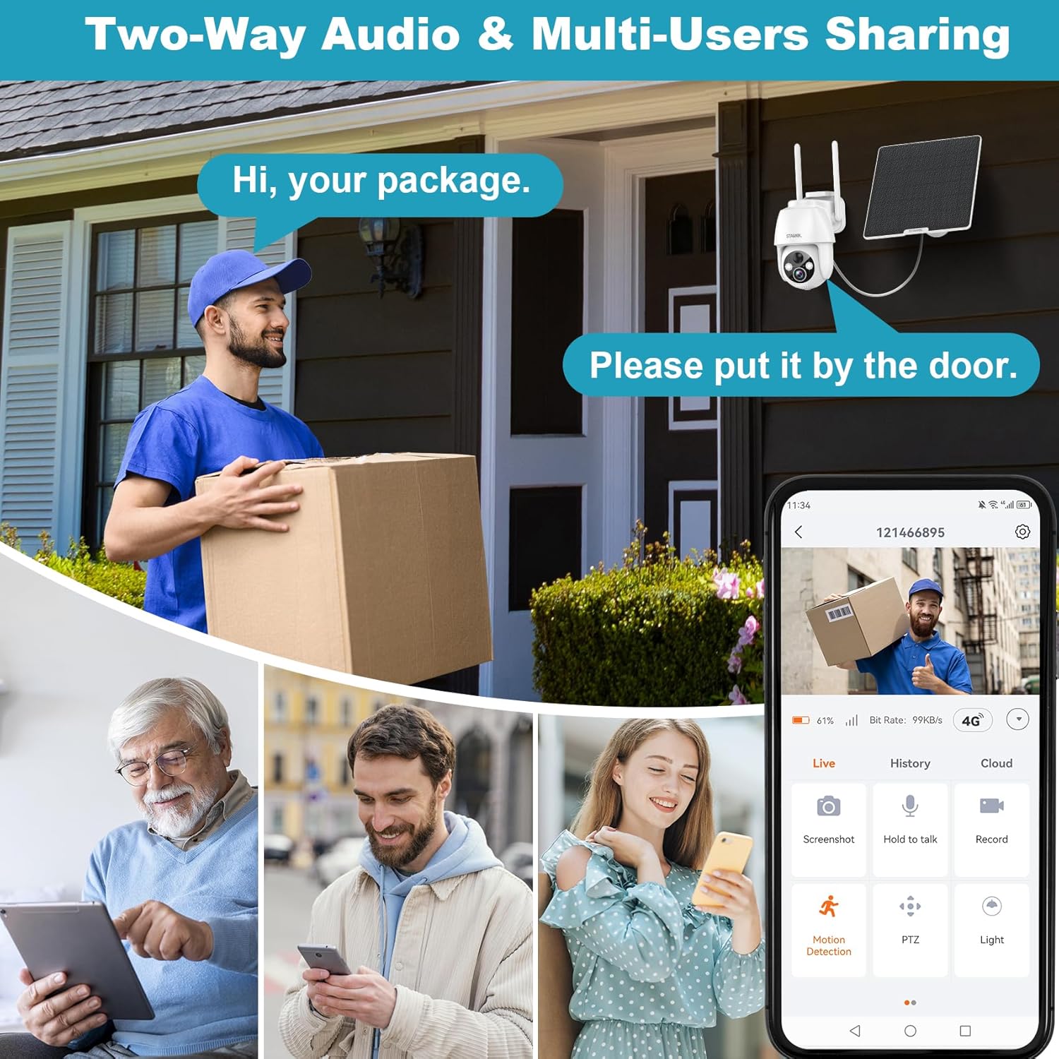 2K Color Night Vision & 360° Full Coverage: equipped with 2 spotlights and advanced image sensor, our cellular security camera provides you stunning clear photos and videos even in low light conditions with a night vision range up to 32.8ft. With the feature of 355° pan, 120° tilt and 5x digital zoom, this PTZ camera ensures a complete coverage of the surrounding without blind spots and you can remotely access the camera from your phone to view real-time footage no matter where you are.