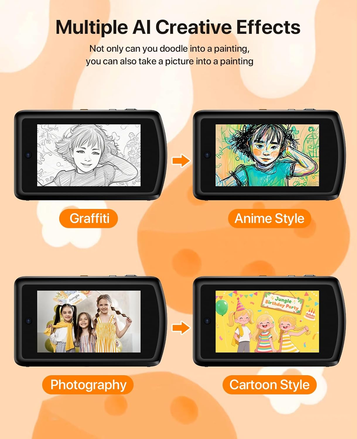 【240 Creative Doodle & 16 Portrait Effects】240 Creative doodle make this AI digital camera fun to use. Kids can trace cartoon templates in doodle mode or turn photos into playful art with different styles. For portraits, 16 portrait effects—like cartoon, sketch, and hand-drawn—add creative flair to every shot. It’s a fun way to inspire creativity and keep kids interested in photography