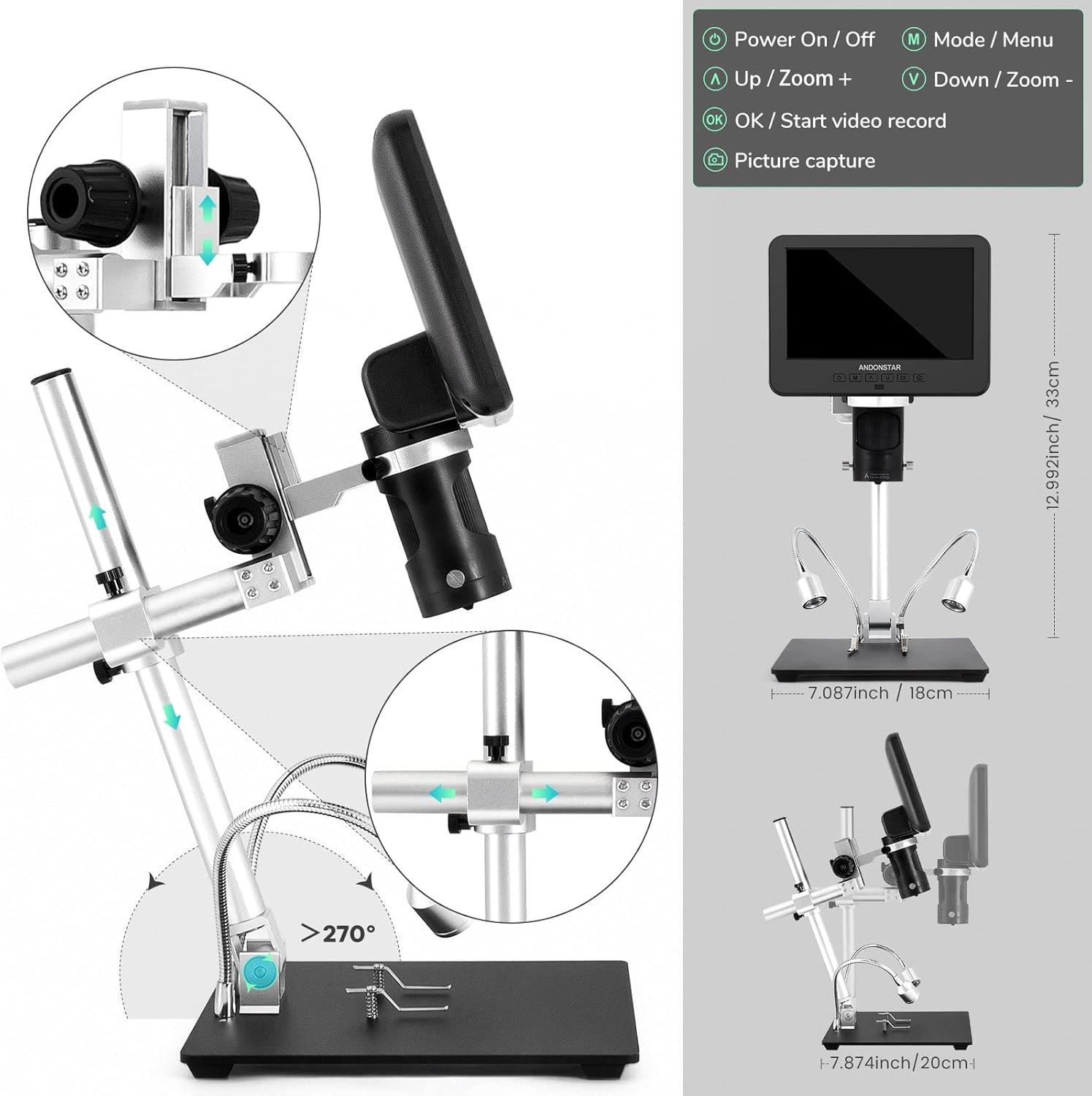 【Soldering Microscope with Pro Boom Arm Stand】: Andonstar’s newest upgraded bracket, size: 7*7.8*13inch, the bracket is adjustable front and rear, left and right, and the bracket angle is adjustable. Meet the needs of your larger work envelope. Strong metal material, suitable for high-temperature environments such as soldering