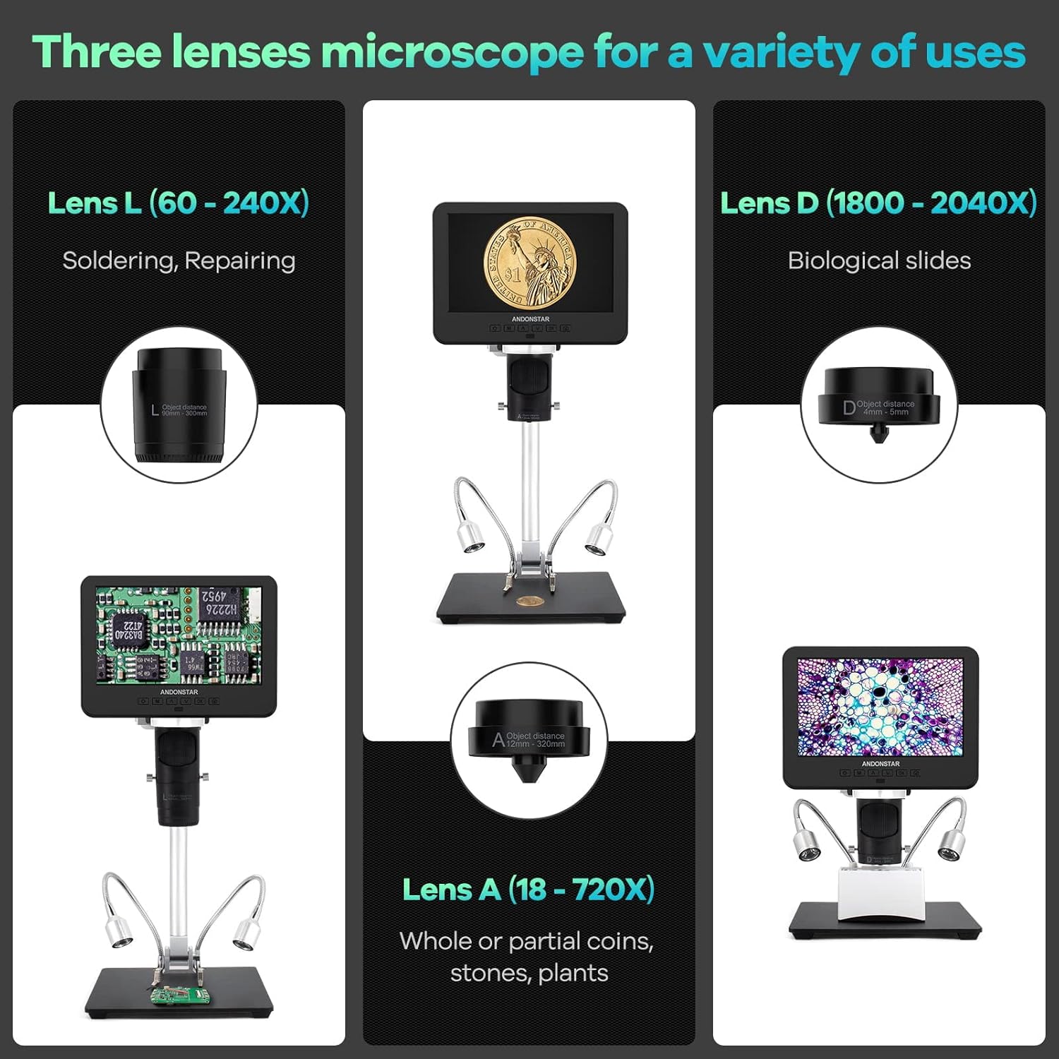 【Andonstar 3 Lens Digital Microscope for Adults】: Lens L for Soldering and Repairing: Can be used to repair circuit boards, mobile phones, etc. Lens A can be used to observe whole coins or parts, plants, stones, etc. Lens D can be used to observe biological slides