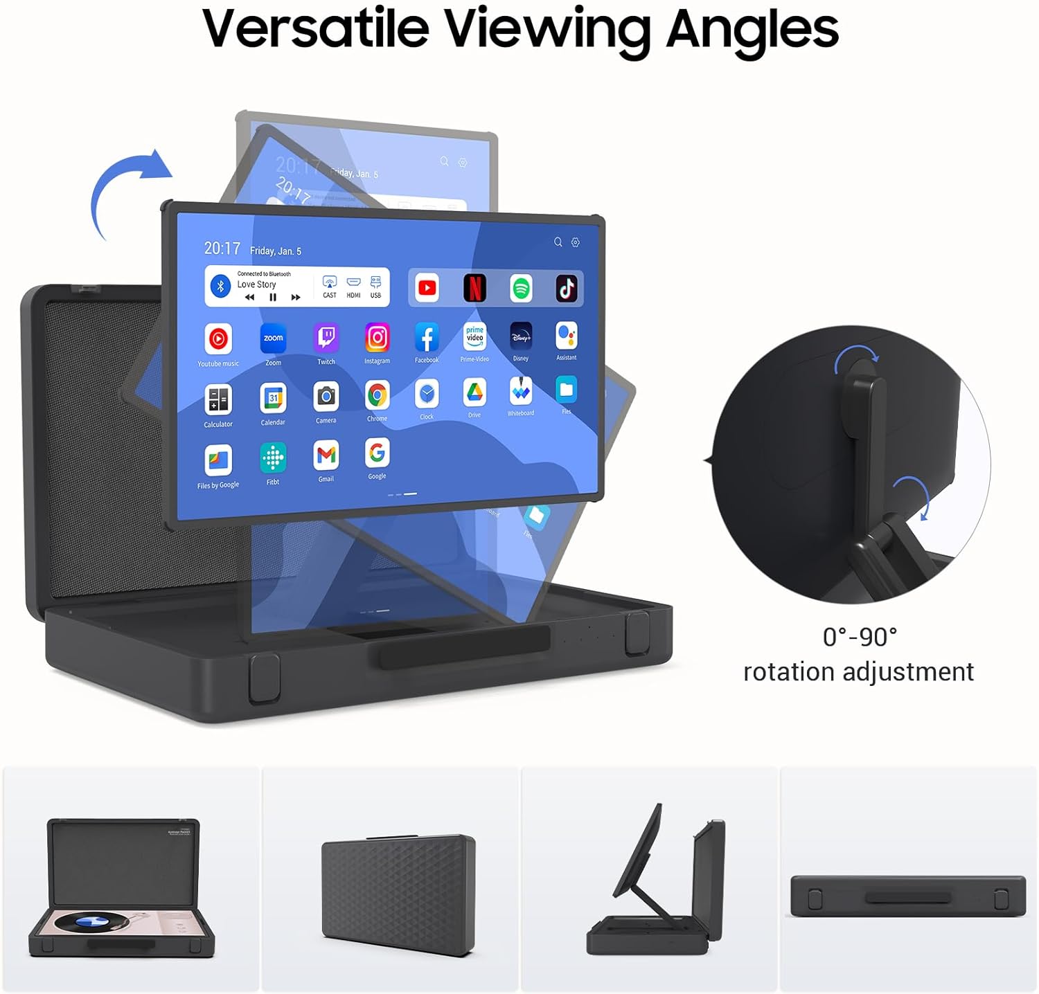 [High-performance PackGo smart screen]: Equipped with RK3588 CPU, 8GB RAM, and 128GB ROM storage, enjoy sharp visuals with a 1920×1080 resolution screen, whether it is movies, games, or TikTok, The screen supports 90° adjustment for flexible viewing angles in any environment. Open the case and start enjoying your favorite content. It can ensure a seamless and fluid user experience
