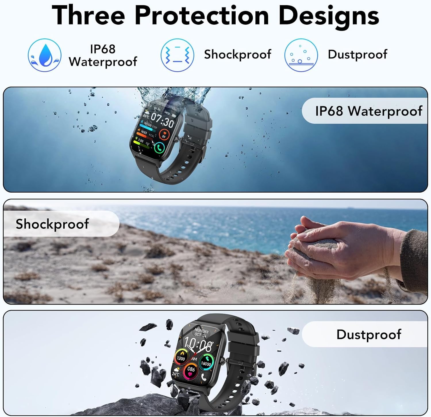 【115+ Sport Modes and IP68 Waterproof】The smartwatch for men features 115+ sport modes such as walking, running, cycling, jumping rope, badminton, basketball, football, hiking, yoga, etc. You can adjust your workout programme according to your activity status. With built-in 3-axis gravity sensor, the running watch accurately records daily steps, distance and calories for safer and more effective exercise.IP68 waterproof rating allows you to wear it in the rain, while washing your hands or sweating.