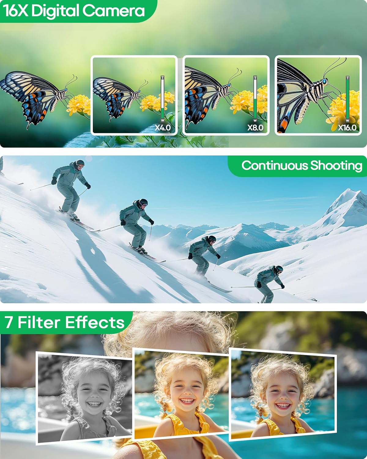 【16X Zoom & Creative Modes】This digital camera makes it easy to shoot distant scenes like wildlife or landscapes with 16X zoom. Enjoy face Beauty, continuous shooting, and self-timer—perfect for parties, travel, or everyday creative moments.