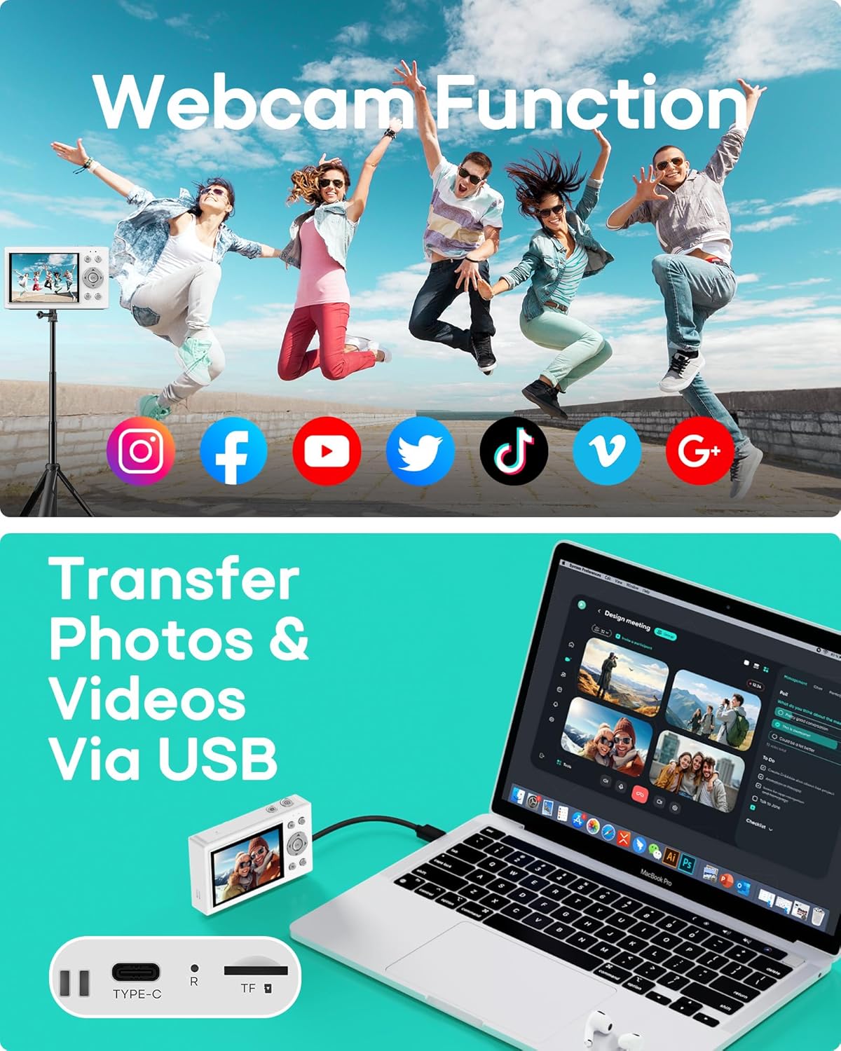 【Webcam Function & Record While Charging】Switch to webcam mode with one click for video calls, streaming, or online learning. The camera also supports recording while charging—eliminating battery worries during long sessions or content creation.