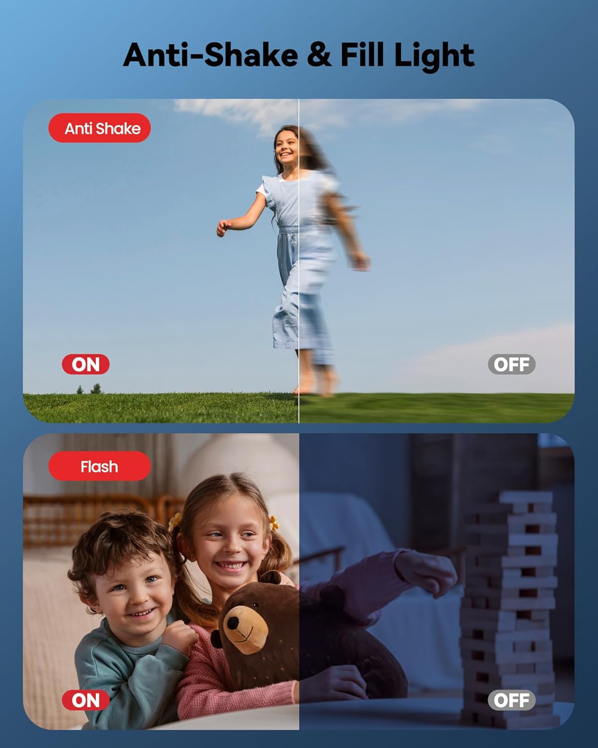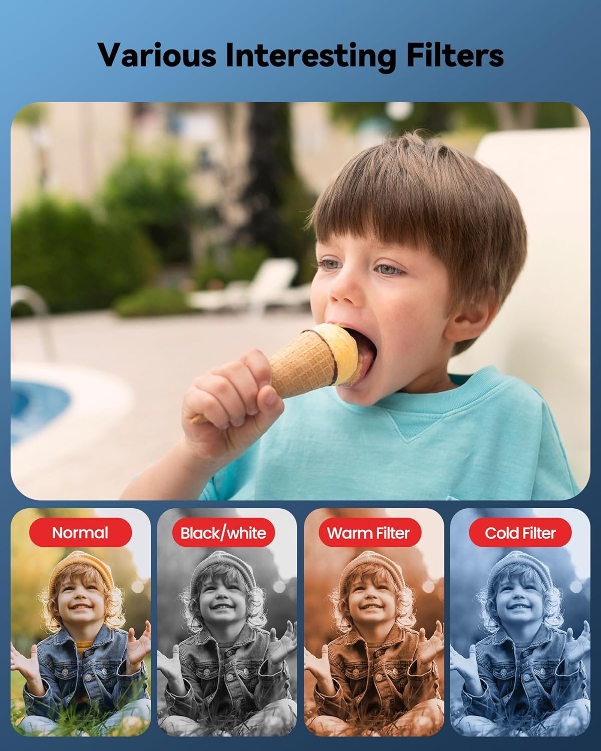 MINI & LONG BATTERY LIFE: This camera for kids is compact and easy to carry. Children can easily put it in a backpack or pocket to capture the beautiful moments in life at any time. Equipped with a high-efficiency battery to ensure long-term shooting, so that children can enjoy the fun of taking pictures whether in outdoor adventures or family gatherings, without frequent charging, and enjoy recording every wonderful moment.