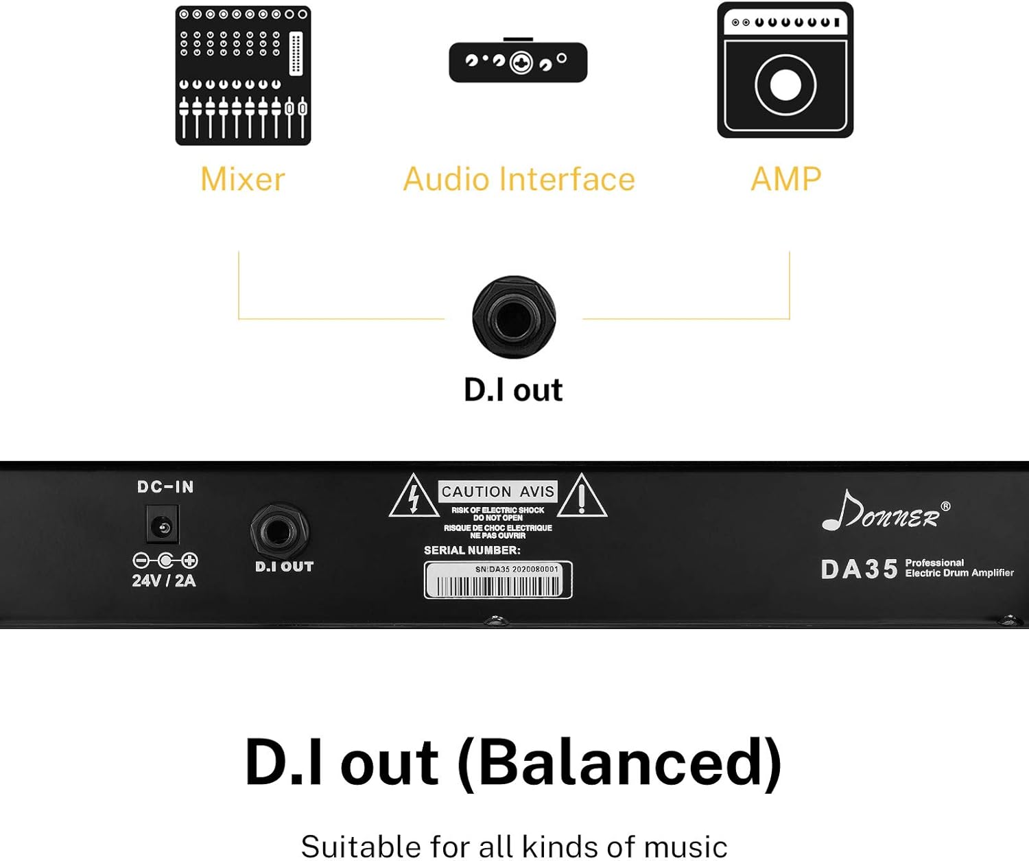 [Equipped with 2 Speakers] 35-Watt Drum Amplifier that with TWO Speakers(LF:8-inch woofer, HF:2.5-inch tweeter, Impedance: 4 ohms ) provides rich tone with intuitive controls. 1/4″ DI Out: Audio output port, which can be connected to other speakers through audio cable to provide audio input to other speakers