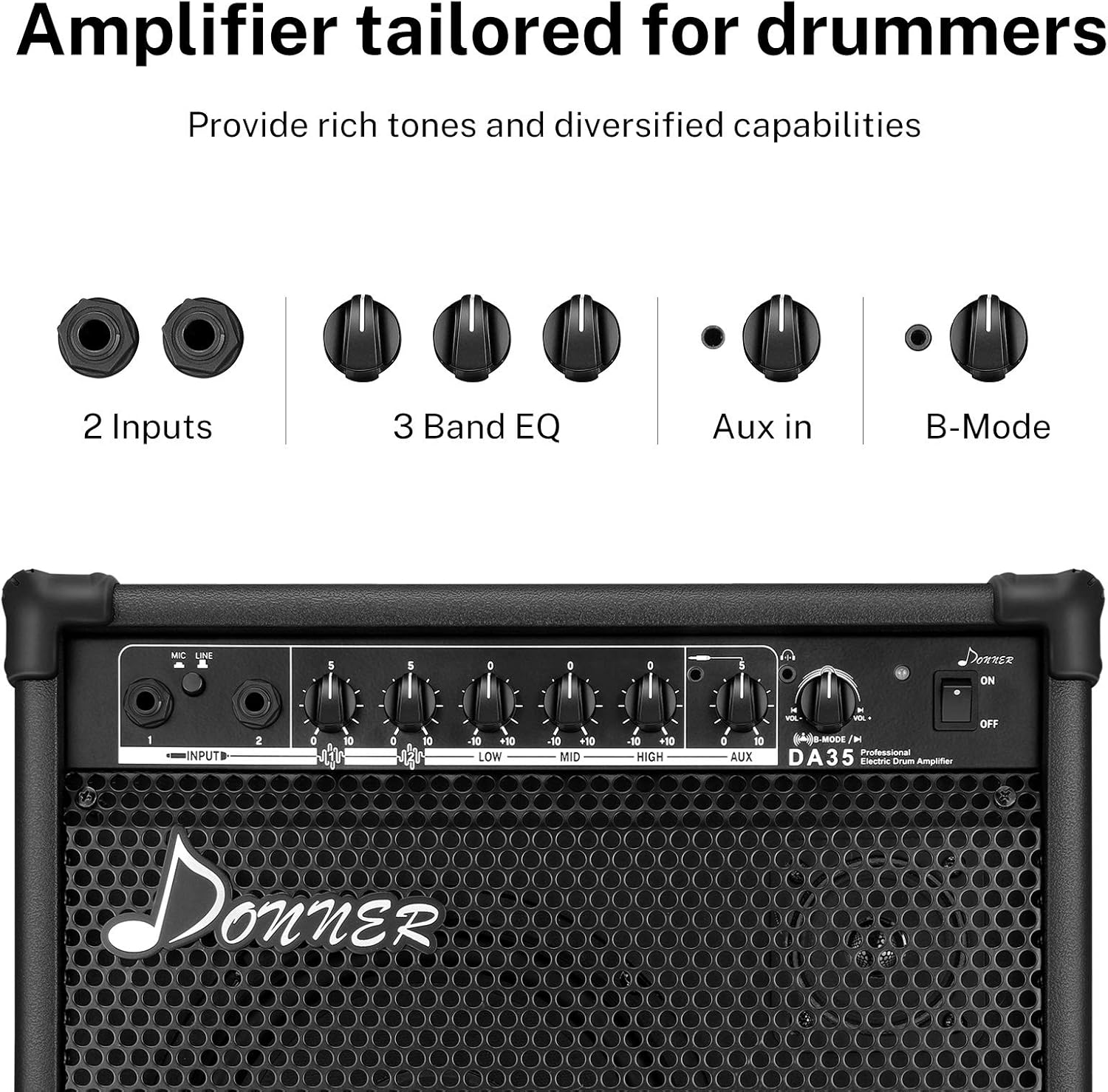 Not exactly sure why this Amp does not appear to have an expected “volume reserve” like most Amps. When I tried it with either electric drums or AI Bass =>Guitar accessory, had to run the volume at 3/4, then if I pushed it to full, there was no difference. For this reason I opted for a “Cool Music” DM80 which Amazon offers a great price deal on (I love you Amazon).Additionally, the look and design of the Donner Drum Amp is “retro” (I already lived through retro and don’t need to re-live it) – whereby the knobs and plugs are not in locations which I prefer for expedient set-up and tear-down. I like all my amps (which I employ 3 for my performances) to look alike. Presently using 2 CoolMusic DM80’s and 1 Roland Cube Ex (all bought on Amazon).Lastly, the “Donner” insignia fell off the Amp grill ……. if the company’s insignia can’t stay on, how will the rest of the Amp stay together? Who at Donner is thinking about these things? Today the most difficult challenge appears to be finding other human beings who actually think rationally.