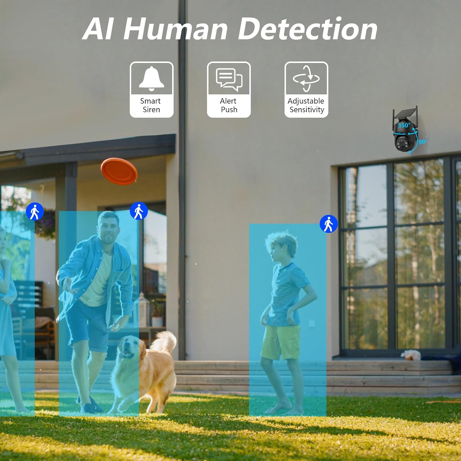 PIR Human Detection & Two-Way Talk: This outdoor security camera wireless has a built-in PIR motion sensor that accurately and intelligently detects human activity, greatly reducing false alarms caused by animals or moving branches. You’ll only be notified when it really matters, giving you peace of mind. The solar security cameras wireless outdoor have a built-in microphone and speaker that provides seamless two-way audio so you can stay in touch with your loved ones no matter where you are. (Not Support 24/7 continous recording)