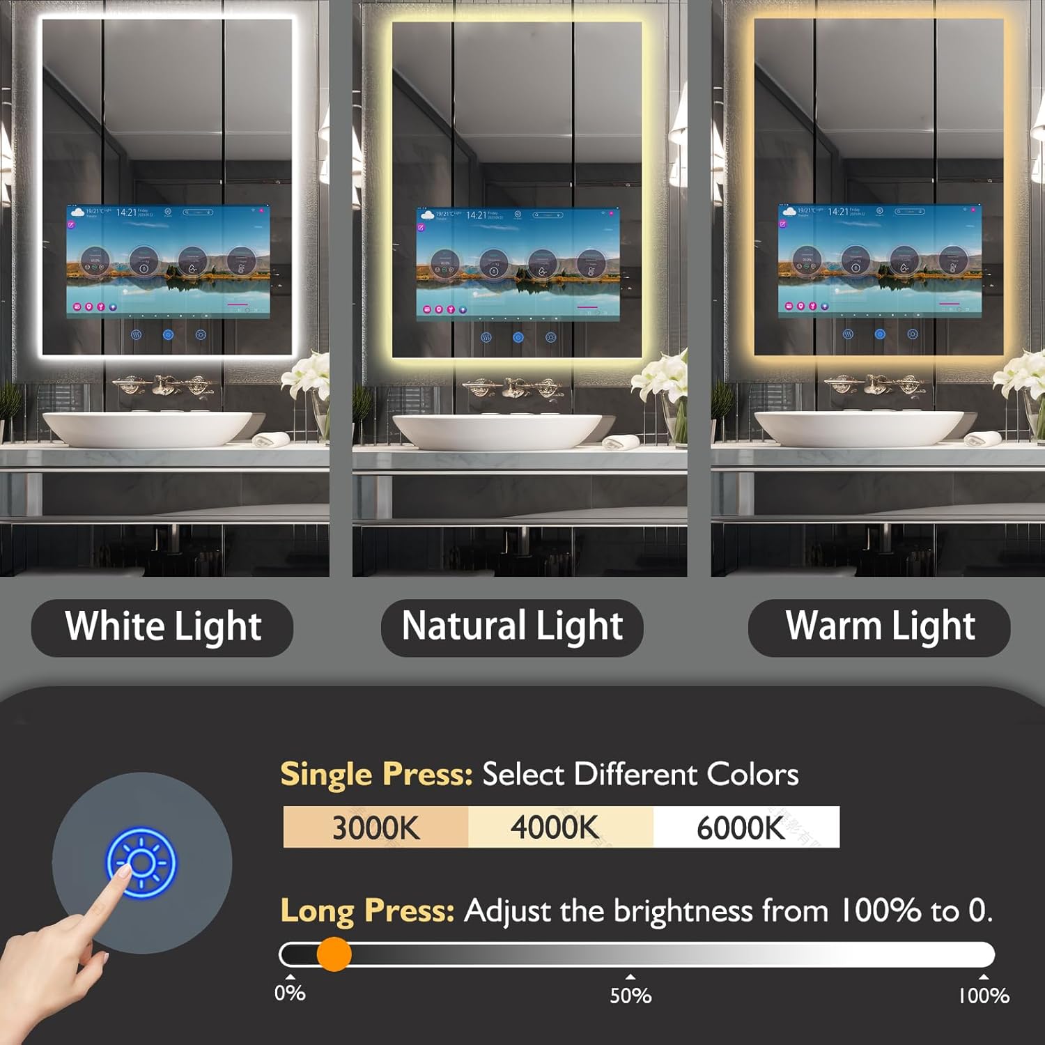 Special Feature | Anti-Fog, 3 Color Temperature, Brightness Adjustable, Built-In Speakers, WiFi Bluetooth, Full Smart Touch Screen, Hidden Smart TV Mirror, Streaming Apps, Weather Forecast Date Note Display |