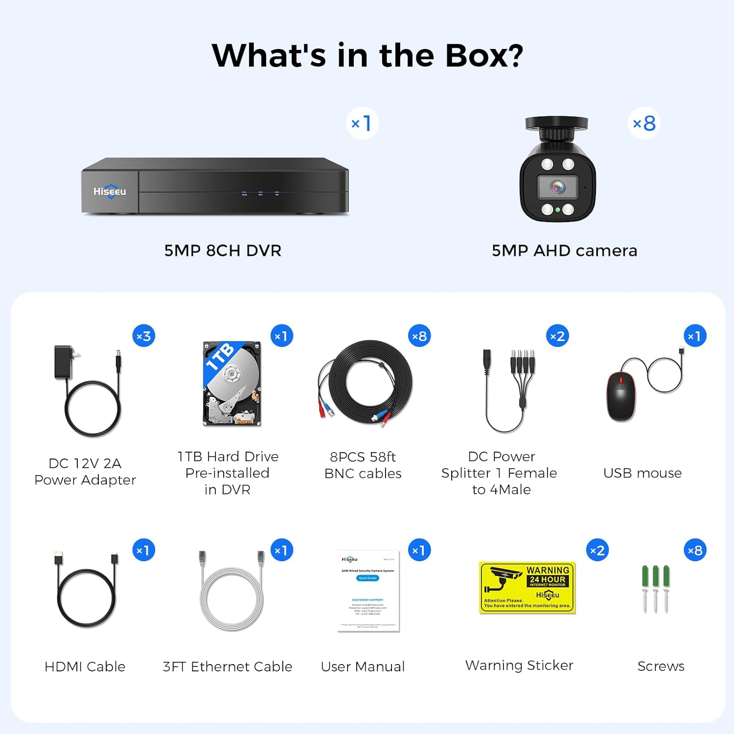 Included Components | 1TB Hard Drive(Pre installed in DVR), 2PCS DC Power Splitter 1 Female to 4Male,8PCS 58FT BNC Cables, 3PCS DC12V 2A power Adapter, 8PCS 5MP TVI Cameras,8Channel 5MP DVR, HDMI Cable*1、Ethernet Cable*1、Mouse*1 、Screws Bags*8 |