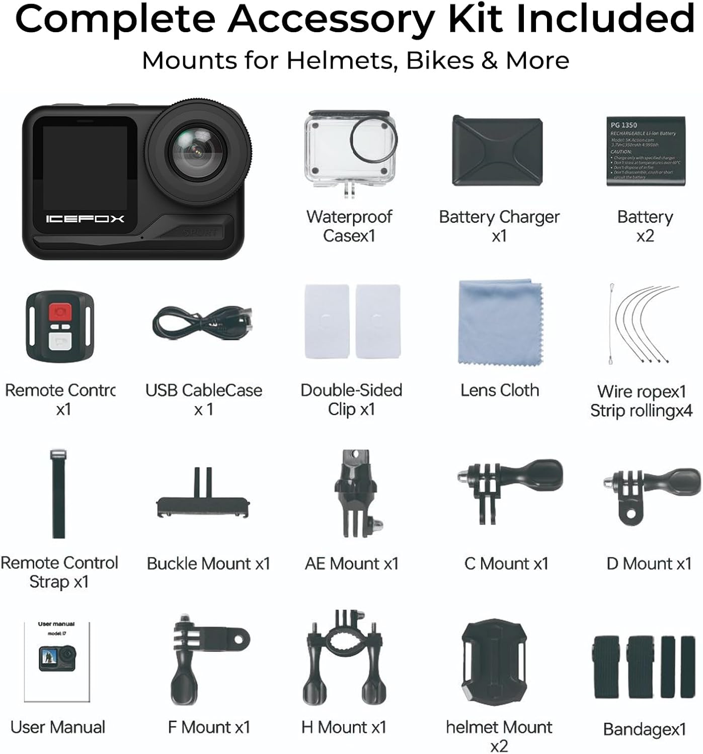 𝗥𝗶𝗰𝗵 𝗔𝗰𝗰𝗲𝘀𝘀𝗼𝗿𝗶𝗲𝘀 & 𝗤𝘂𝗶𝗰𝗸 𝗜𝗻𝘀𝘁𝗮𝗹𝗹𝗮𝘁𝗶𝗼𝗻:Accessories Include icefox i7 action camera, 2 x batteries, waterproof case, USB cablecase, remote control, user manual and more. This action camera comes with all essential accessories for quick, easy setup—perfect for beginners. Its versatile mounts let you attach it to bicycles, helmets, surfboards, handlebars, dashboards or other gear.