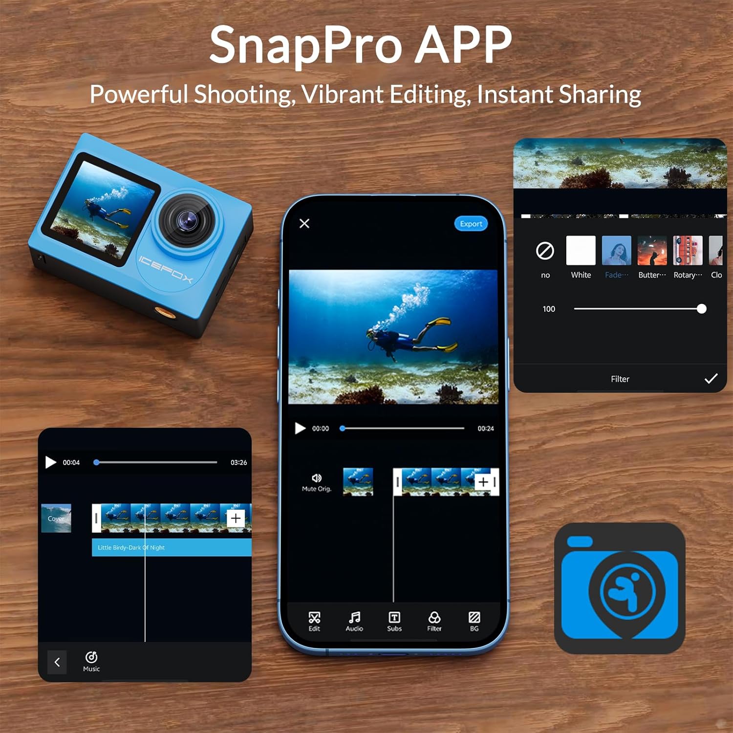 【Powerful APP Functions】Connect the camera to the Snap-Pro APP via WiFi, and easily import and export images and videos. The APP’s video editing feature offers a wealth of tools and materials. Users can import background music, add subtitles, select filters and backgrounds, and preview the editing effects, meeting diverse creative needs.