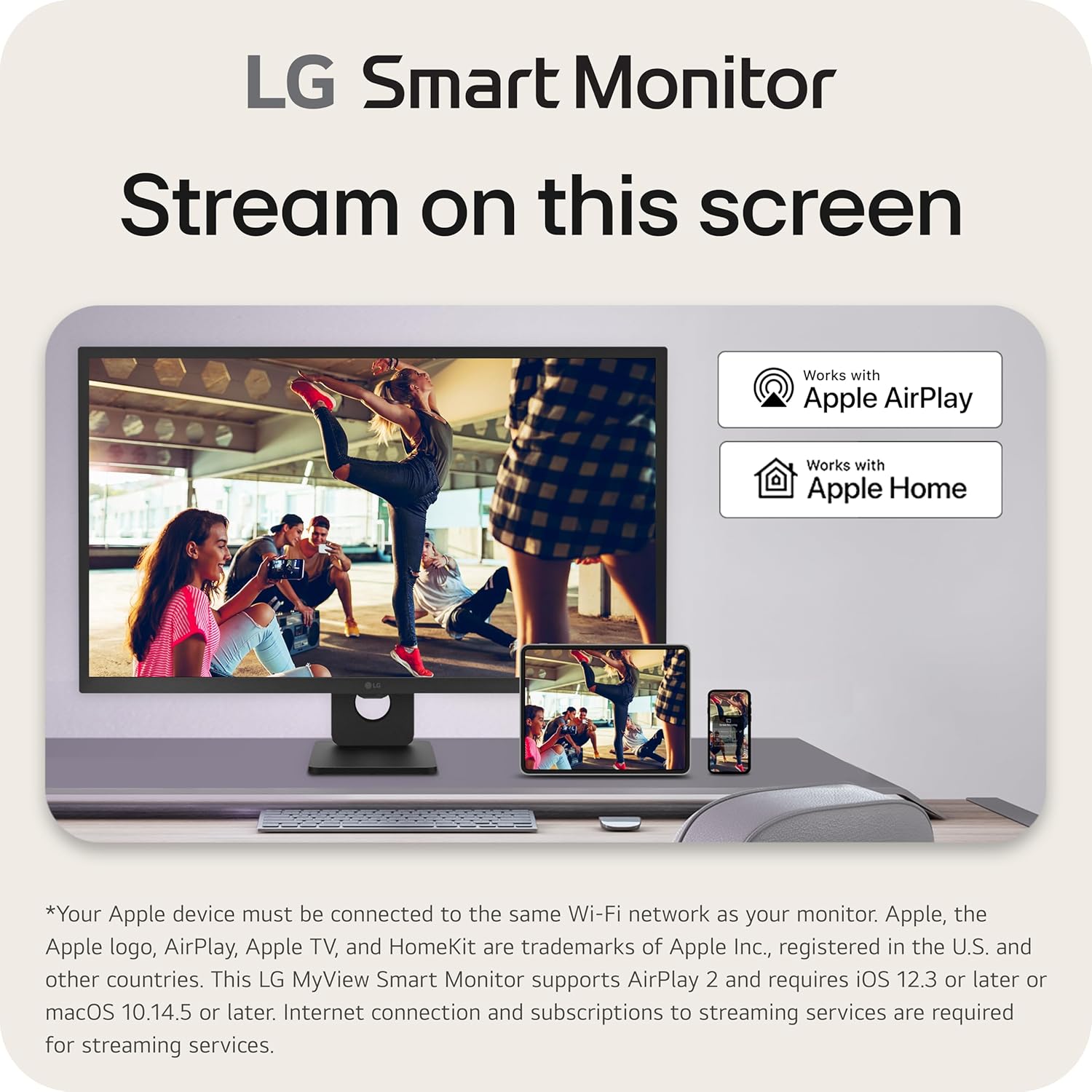 LG 32SR50F-B Smart Monitor 32-Inch FHD (1920×1080) IPS Display, webOS Smart Monitor, ThinQ Home Dashboard, LG ThinQ App, Remote Control, x2 Built-in Speakers, AirPlay 2 Screen Share Bluetooth, Black. ¹Internet connection and subscription to streaming services are required. ²Home Office services support only Microsoft 10 and 11 or higher. Microsoft 365 and Google registration and subscriptions may be required. Separate services may require payment for subscription. Supported service may vary by country. ³Internet connection and subscriptions to streaming services are required. Amazon, Prime Video and all related logos are trademarks of Amazon.com, Inc. or its affiliates. Amazon Prime membership and/or Prime Video fees apply. See primevideo.com/terms for details. HBO Max 2023 Warner Media, LLC. All Rights Reserved. HBO Max is used under license. Number of LG Channels subject to change. ⁴Your Apple device must be connected to the same Wi-Fi network as your monitor. Apple, the Apple logo, AirPlay, Apple TV, and HomeKit are trademarks of Apple Inc., registered in the U.S. and other countries. This LG Smart Monitor supports AirPlay 2 and requires iOS 12.3 or later or macOS 10.14.5 or later. Internet connection and subscriptions to streaming services are required for streaming services.
