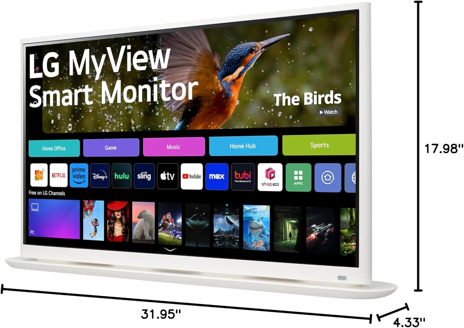 This was a perfect fit for my space…I wanted a 32 inch monitor but due to shelving firmly installed above, I was limited in the height. This monitor sitting as it does on its base was perfect, and I have other LG TVs in the house, and I was familiar with the interface. I have read a few critiques from others which I think are not valid: someone wrote that when you switch this monitor on it always goes to the LG Home Screen and not the computer (most likely HDMI) feed. That is a setting on the monitor…it does default to “Home” which is the LG screen but you can set it to “last Input” and your TV HDMI link will be there if that indeed was your last input chosen. There is Ethernet and WiFI both, and I have used to-date only the Ethernet connection. I have set the time out on the monitor longer (in the Win10 power area) and set the screen saver shorter with the idea of keeping the monitor’s screen in good condition. Unlike the TVs, the LG monitor asks if I want Filmmaker Mode when I use Prime, Netflix, and I chose No, and finally Don’t Ask me Anymore. I find that is too dark for my desktop area. I am sure for those people absolutely consumed by how black the pixels are or how fast the swords move in a battle, that this may not be the best choice, but if you are so into those details buy an actual LG TV, not this monitor. And those things seem fine to me when I look at them on my monitor anyway. Someone also complained that if you have a remote (or magic remote) for another LG tv in the same room, commands operated by a remote onto the TV affect this monitor. I have never found that to be the case, and in fact our living room LG magic remote won’t work on the Family Room LG TV…I think they are each “recognised” as linked to one TV at a time. My monitor and LG TV are about 10 feet apart—no problem.For now, I have speakers plugged into my computer which means when I use Prime, e.g., on the monitor I rely on the LG speakers. This of course could be bettered with speakers directly attached (optic link probably) which I may do at some point. I can see in Win 10 I could re-route the computer’s sound to the monitor’s speakers, then on the LG tell it to use the external speakers only that I would eventually install, so don’t foresee a problem.In short, I love the extra space on the screen and am very happy with this purchase overall. p.s. the USB-C connector in the back does allow for charging your iPhone/devices !