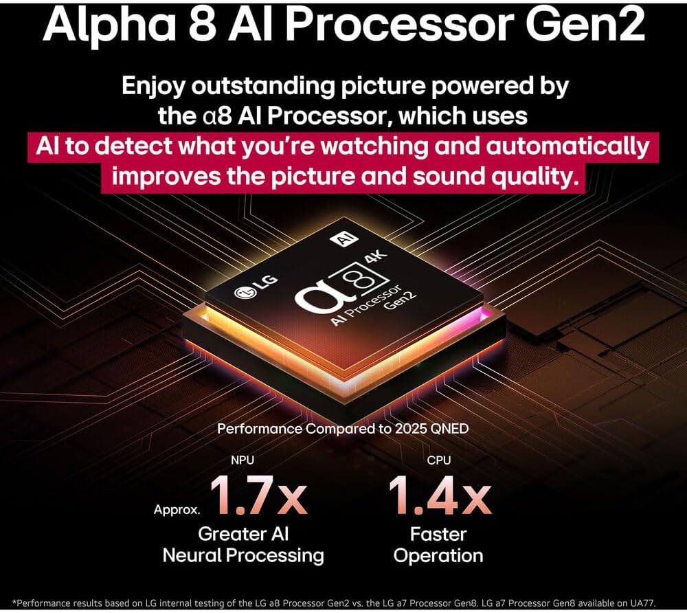 You’ll enjoy outstanding picture powered by the Alpha 7 AI Processor Gen8, which uses AI to detect what you’re watching and automatically improves the picture and sound quality. You’ll also experience less searching and more streaming, thanks to the next generation of AI technology from LG webOS 24.