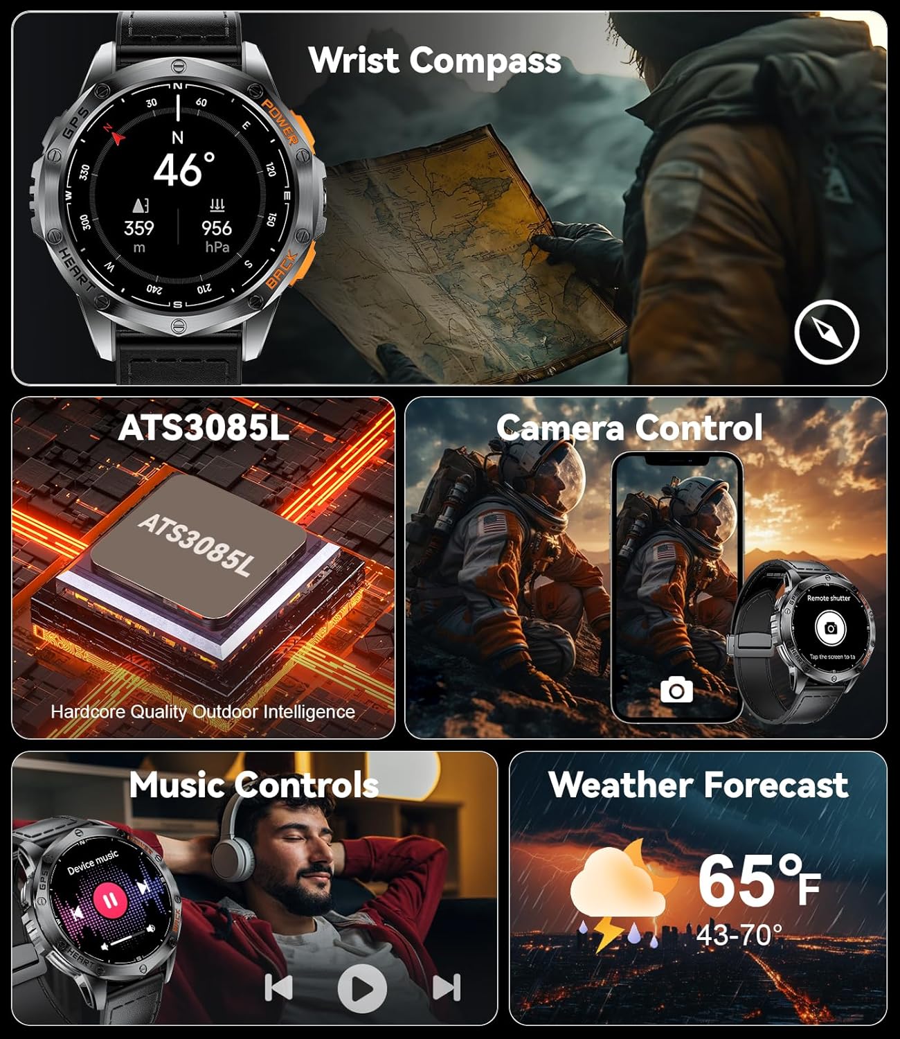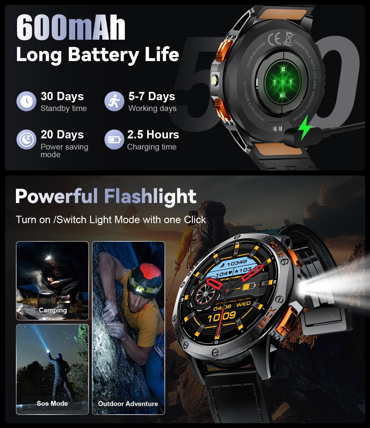 🧭【Compass & GPS & LED Flashlight】 This smart watch men supports a compass and GPS, as well as satellite systems including GLONASS, Beidou, Galileo, NAVIC, and QZSS, allowing you to accurately track your route during outdoor activities and providing comprehensive support for your adventures. For outdoor enthusiasts, this feature enhances safety and adds more enjoyment to outdoor activities. And the mens smart watch is equipped with a powerful flashlight function suitable for various situations. Whether you’re camping at night, looking for something, or handling an emergency, the flashlight provides ample illumination. (*Note: GPS route tracking should be activated in open areas.)