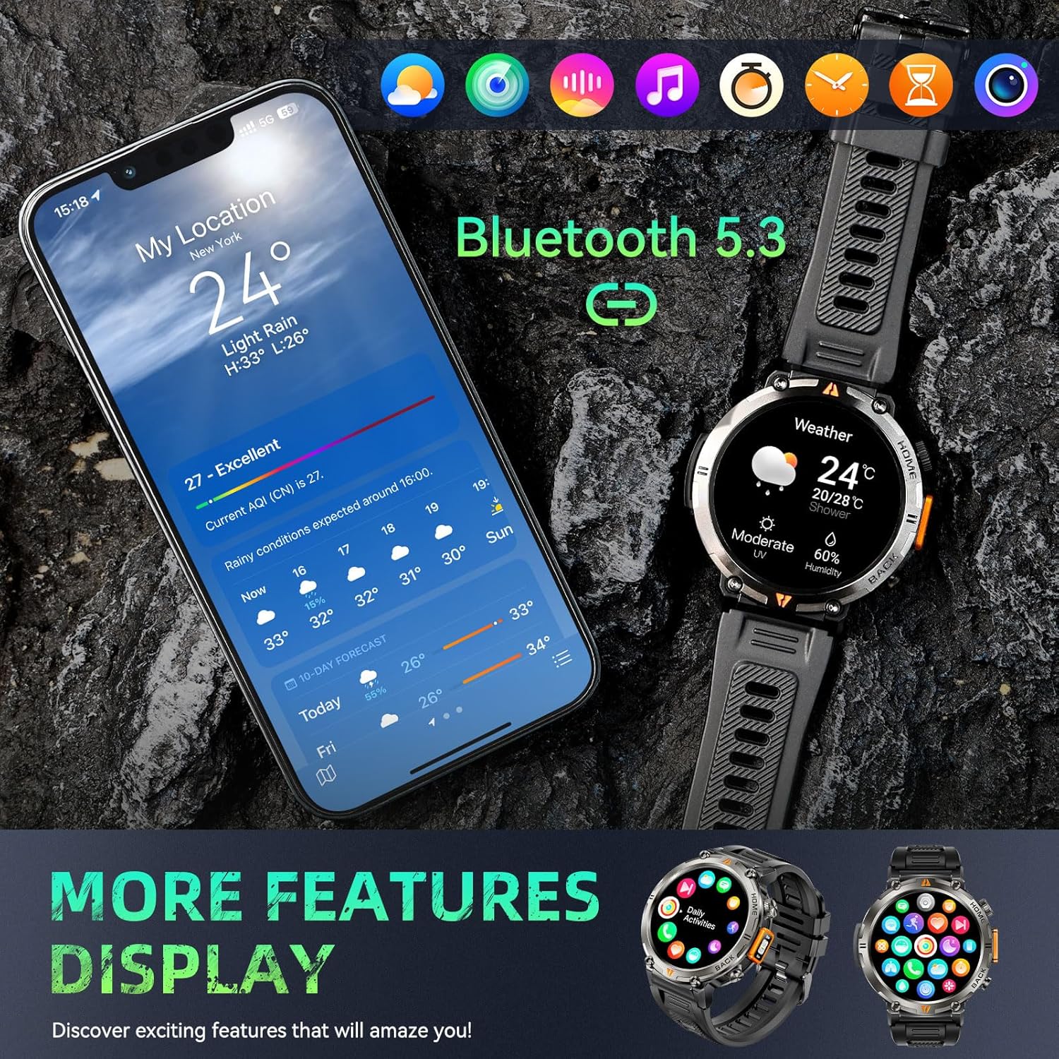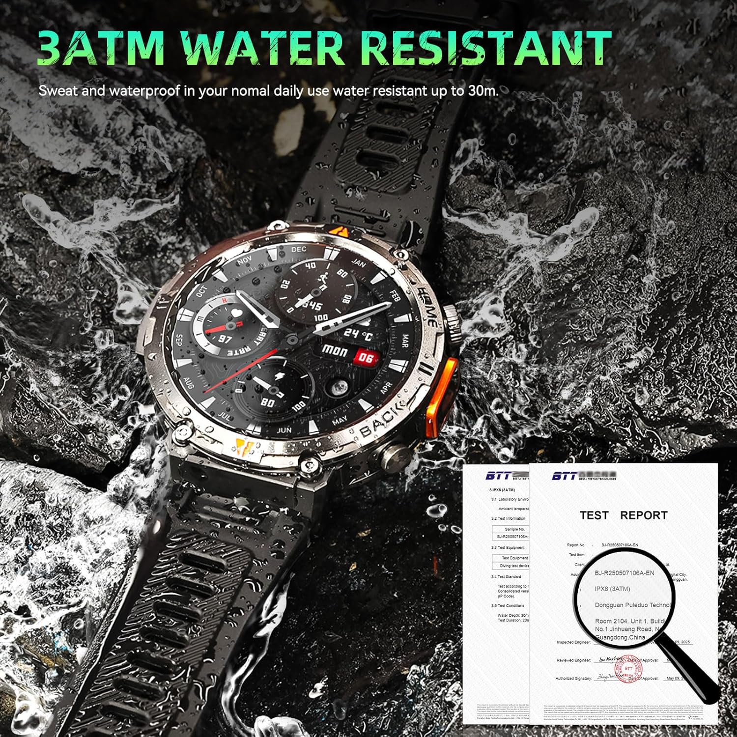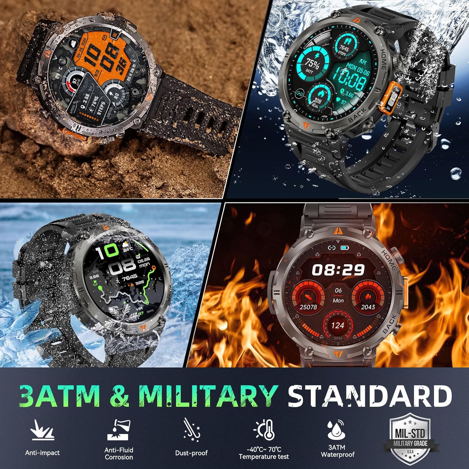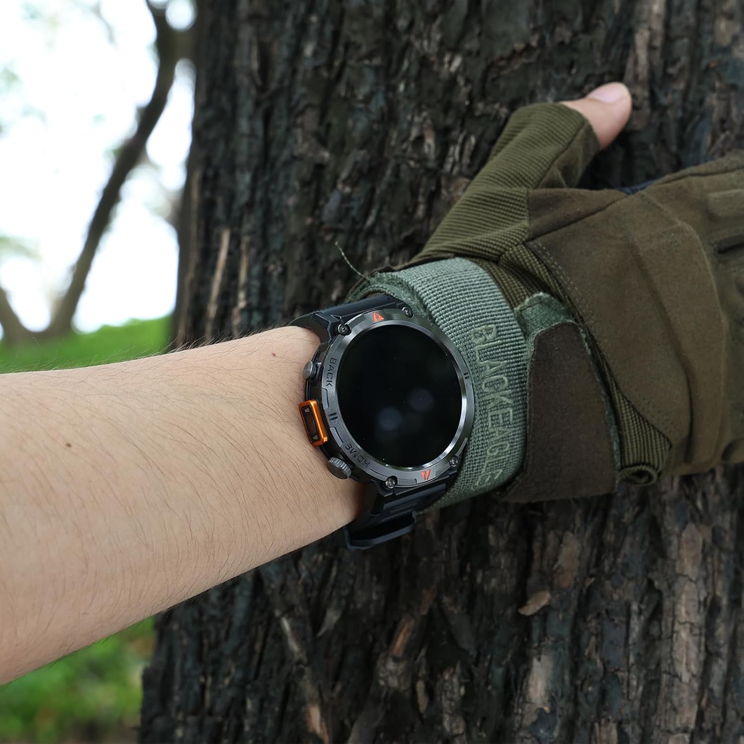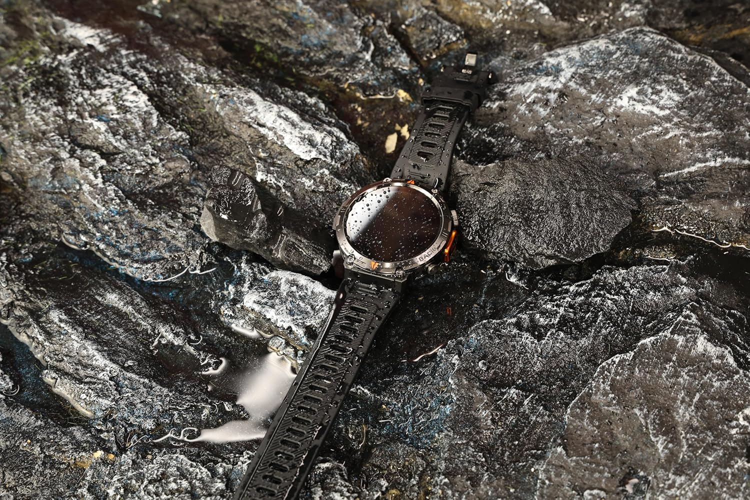 This military smartwatch has a 3ATM waterproof rating, which allows me to wear it without worrying about water getting into the watch and easily handle any situation. The rugged smartwatch is perfect for outdoor activities.