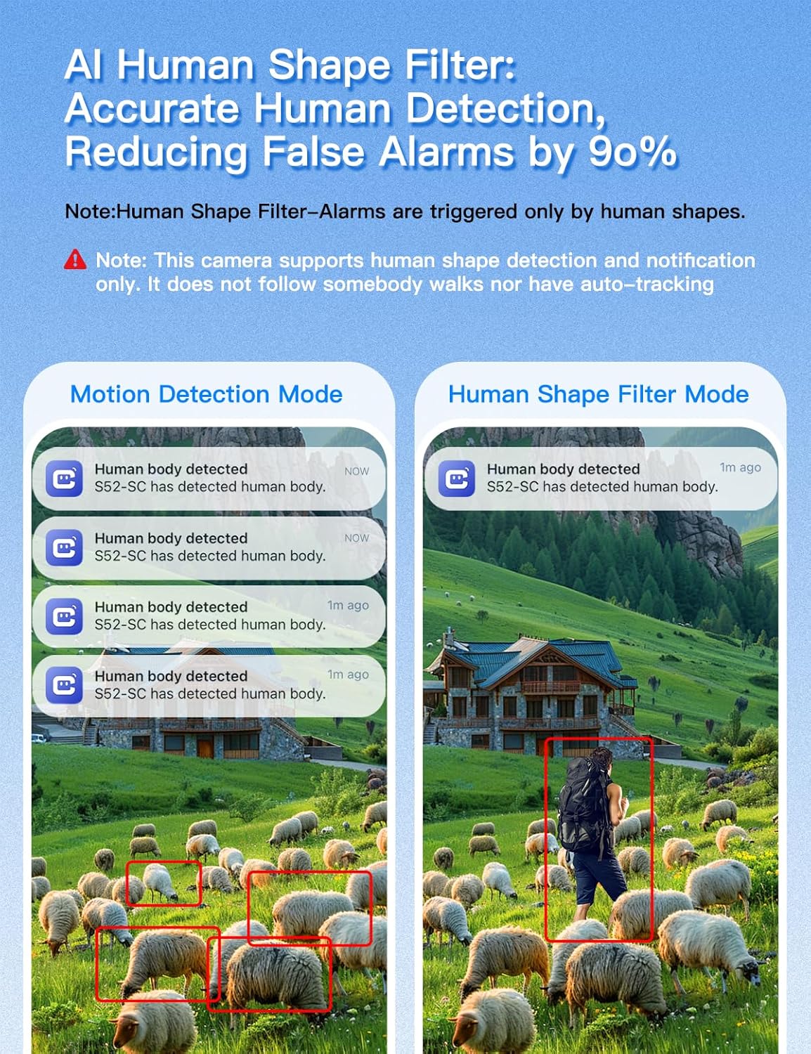 PIR and AI person detection, minimizing false alarms and keeping you informed of relevant events.