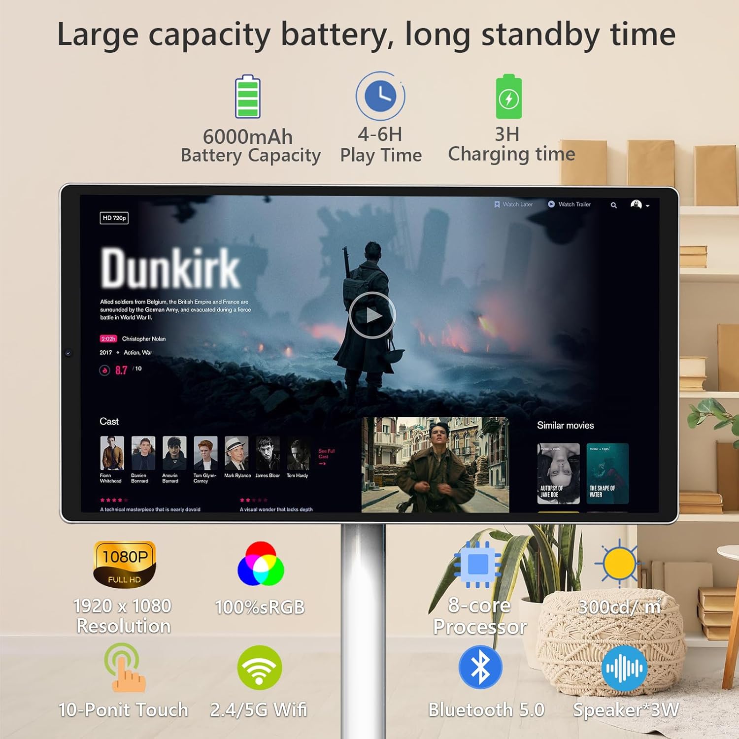 【Long-lasting battery life and wireless projection support】Portable TV is composed of a smart touch screen, a pole, and a base with a battery. The battery capacity is 12V, 6000mAh. Once fully charged, it can be used continuously for 4-6 hours without being plugged into a power source. In the same wireless Wifi state, and by pairing the monitor with the Bluetooth of other devices, you can wirelessly project in the pre-installed TranScreen App, which features a mouse function to control the screen. The projection function supports Android, iPhone, Windows, and Mac computers.