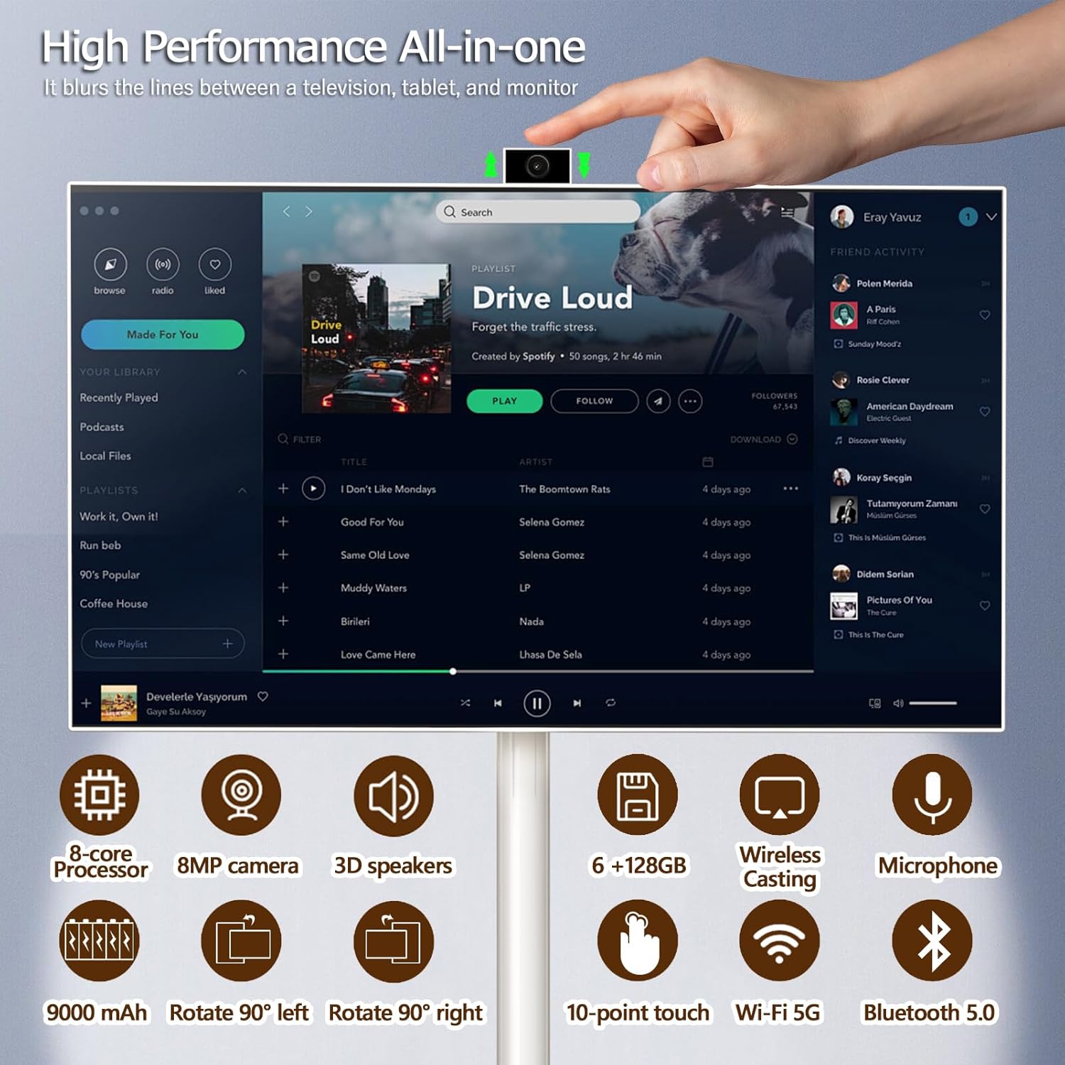 【Removable Android Tablet Monitor】Tablet monitor with wheels uses a 21.5-inch IPS screen with 100% sRGB, FHD1080P, 60HZ, and built-in speakers*2 (3W+3W). It is a mobile smart screen suitable for learning and teaching, leisure and entertainment, and work assistants. You can use it to learn the yoga moves you want, learn cooking, watch movies, watch Tiktok videos, and wirelessly cast screens. The silent wheels on the base make it convenient for you to move it around the house at any time, or even move it outdoors.