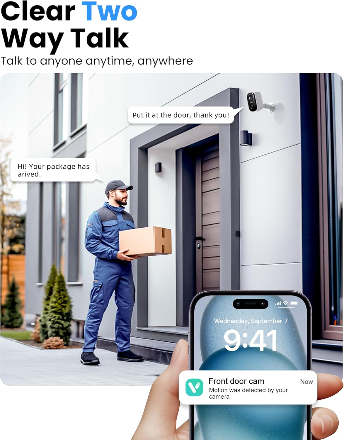 【Two-way Talk & Multiple Alarms】 The home security camera has a built-in microphone and speaker, allowing smooth and clear two-way conversations with visitors at the door. When motion is detected, the surveillance & security cameras will sound an alarm, the white light will flash(This function is disabled by default and can be set in the APP), and it will record video clips in real time, sending this message to your phone via the app, effectively driving away some uninvited guests