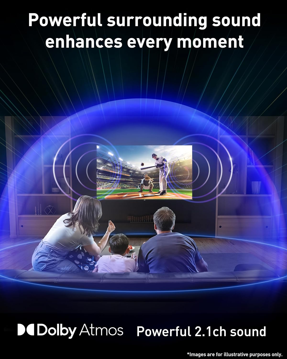 Dynamic Theater Surround with Dolby Atmos: A dedicated built-in subwoofer delivers an enhanced low end frequency. Together with Dolby Atmos, sound effects are precisely placed in virtual space and time to envelope you in the atmosphere.