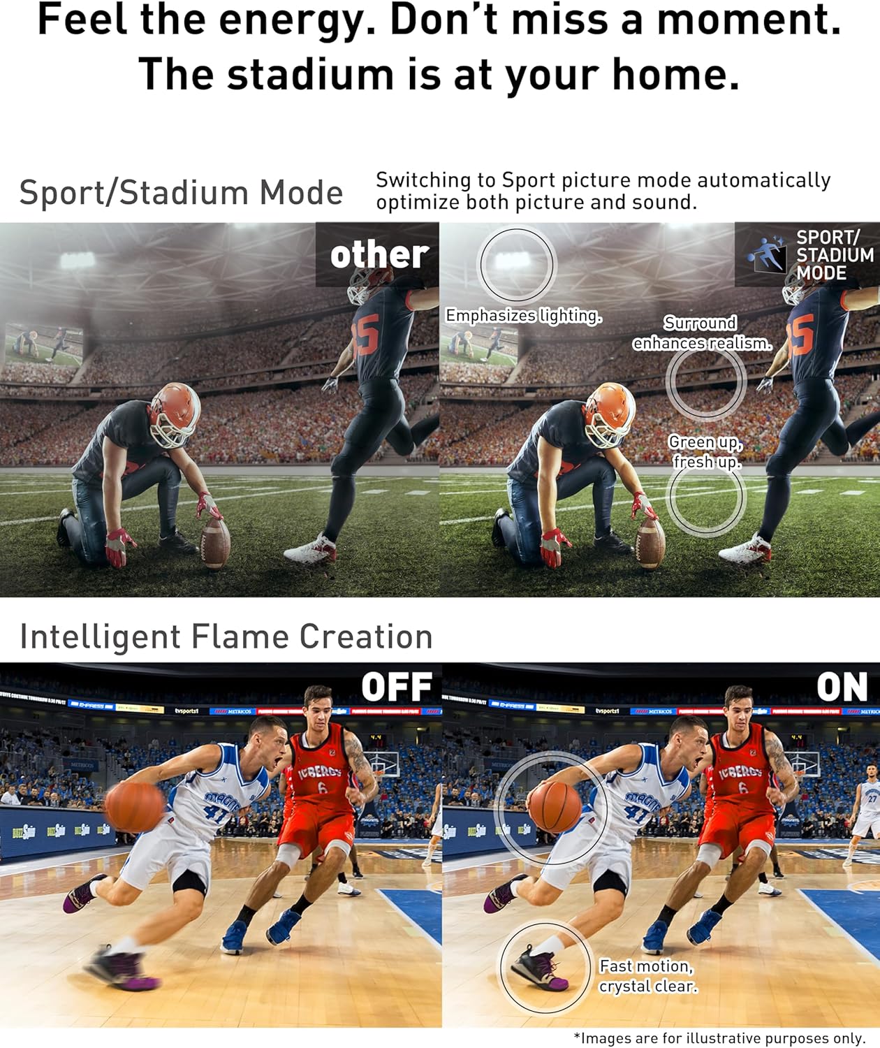 Sport Mode and Stadium Mode: Immerse yourself in the game on your Smart TV with specially tuned picture and sound settings that recreate the excitement of live stadium viewing.