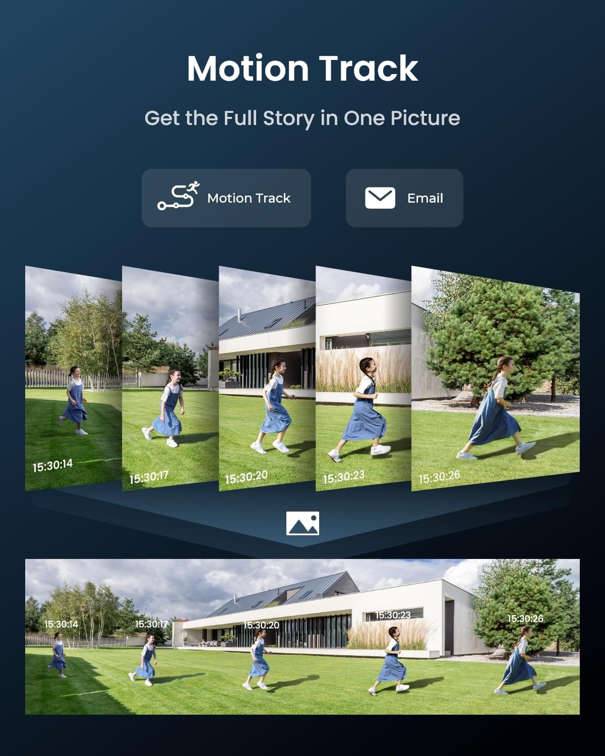180° PANORAMA & MOTION TRACK: Thanks to dual-image stitching algorithms, the dual lens camera presents a complete 180° panorama with minimal distortion. Its Motion Track feature displays the complete movement of the target over time in one frame for effortless monitoring.