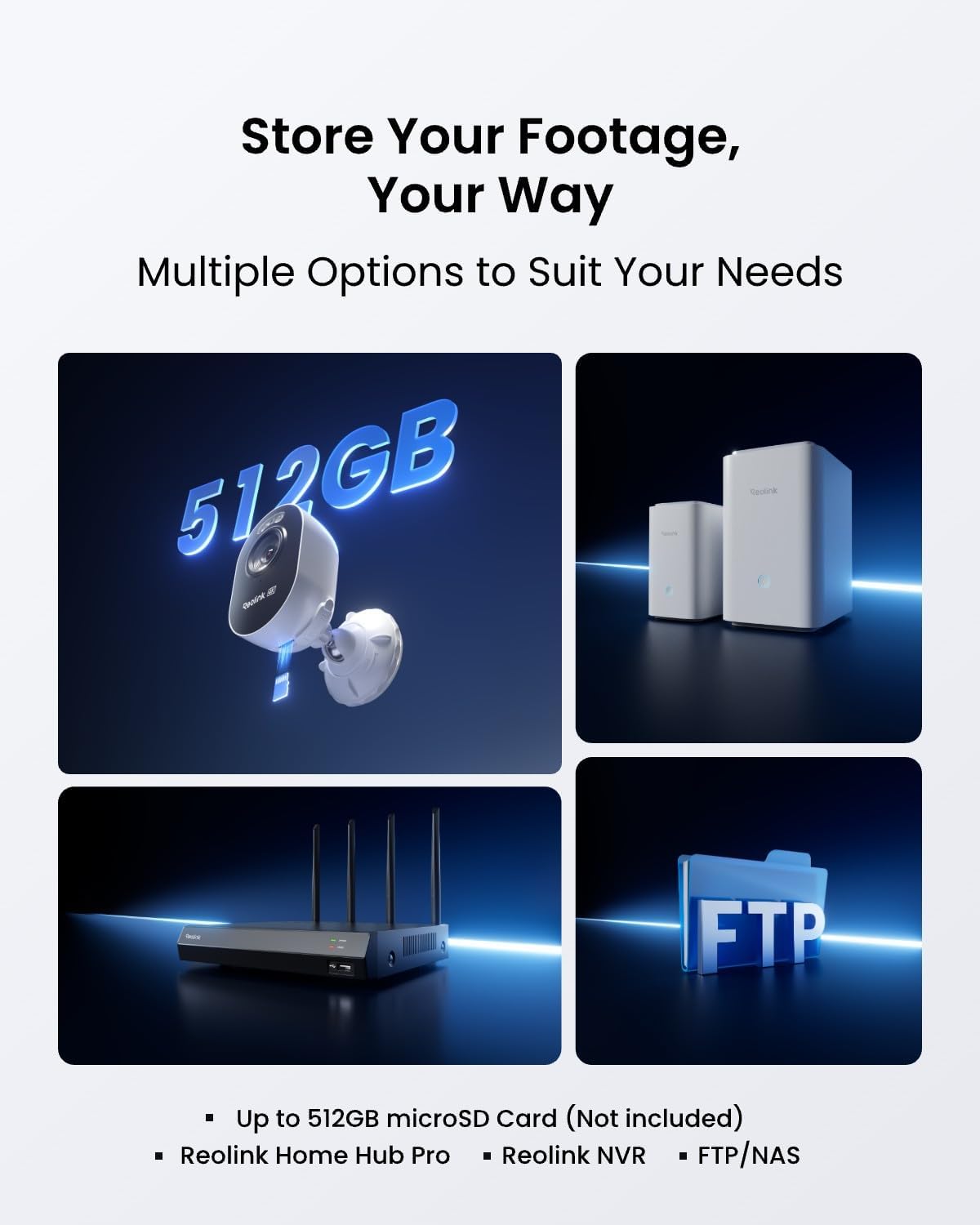 FLEXIBLE STORAGE OPTIONS: Choose the storage solution that best suits your needs. Record locally to a microSD card (up to 256GB, not included), encrypted Reolink Home Hub Pro or NVR, or use your own FTP or NAS for remote backup and access.