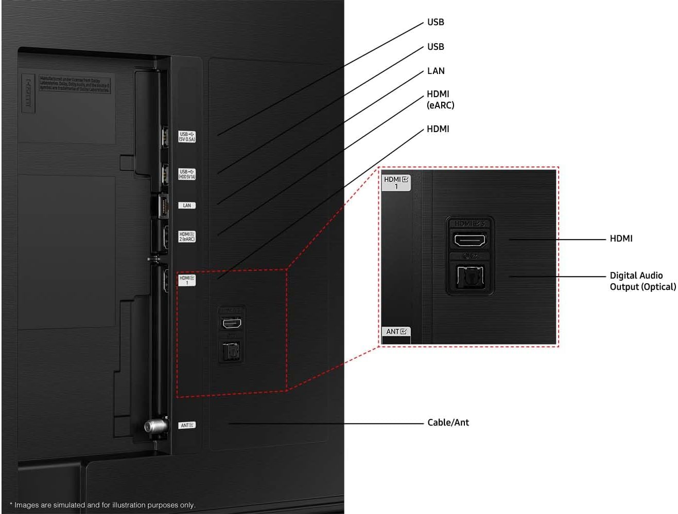Special Features | UHD Dimming, Auto Game Mode (ALLM), Alexa built-in, Samsung TV Plus, Samsung Smart Hub, Multi view, SmartThings compatible, IP control support, Q-Symphony, Adaptive sound, Two-way Bluetooth 5.2, Filmmaker Mode, SolarCell rechargeable remote |