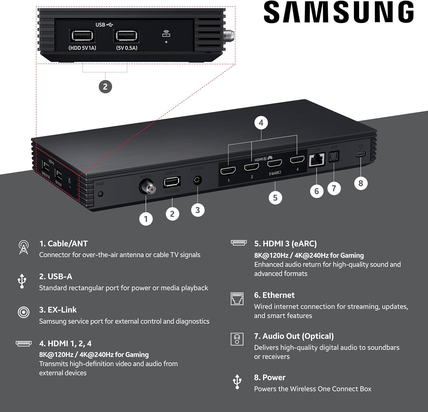 **Wireless One Connect must be connected to the TV wirelessly for full TV functionality. Wireless connection may be affected by surrounding environment, may not connect when enclosed or blocked by metal (e.g., from inside a metal cabinet) or by other physical objects such as walls. TV and Wireless One Connect require separate power cord connections.
