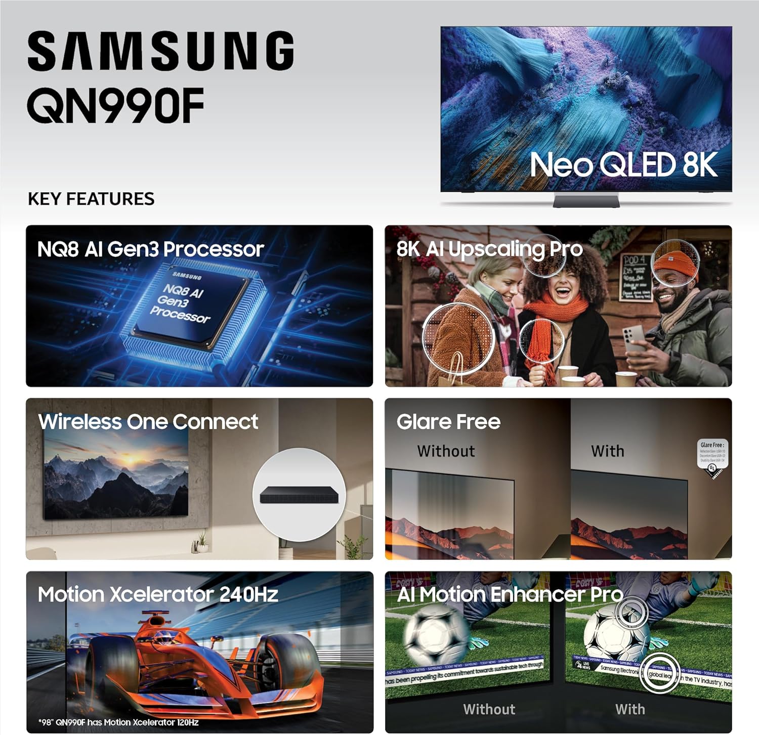 OUR MOST ADVANCED AI-POWERED 8K PROCESSOR: Powers the best AI-enhanced 8K TV experience from Samsung. It optimizes your content so your movies, sports and video games look incredible, no matter what you watch.*