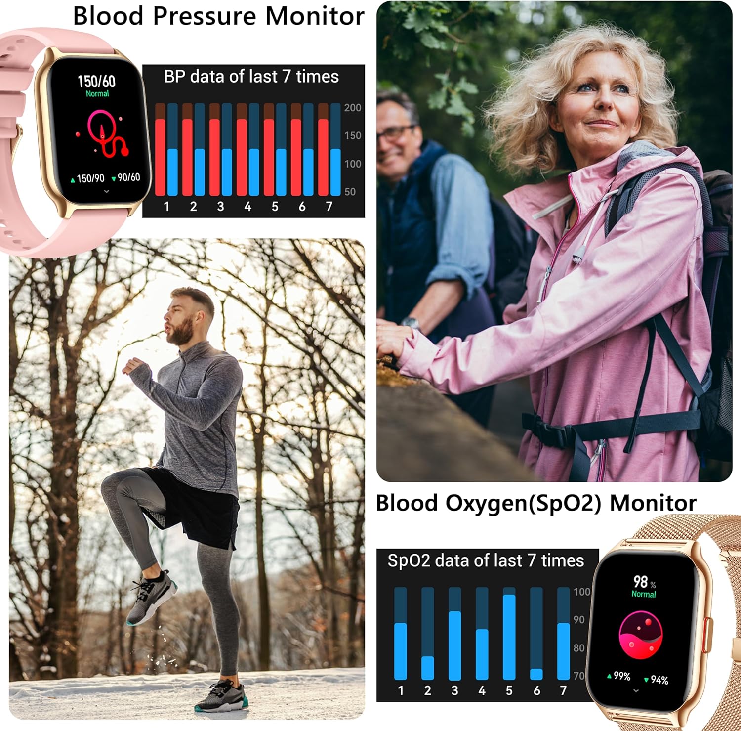 100+ Sports Modes & Daily Water Resistant: Discover over 100 sports modes available in the app. The activity tracker records exercise duration, calories burned, steps taken, distance covered, and more. The smartwatch is water resistant for daily life, such as washing hands, wearing on rainy days and etc. It should not be worn during bathing, diving, or saunas and so on.