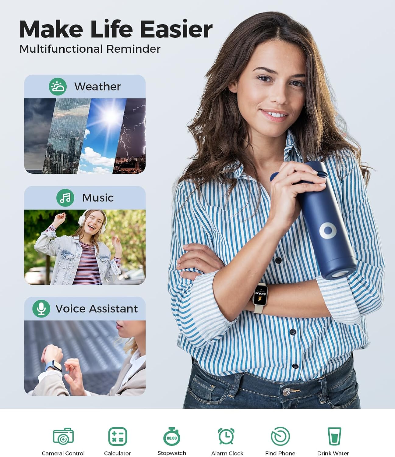 【Multiple Practical Functions】The activity trackers and smartwatches with various smart features including menstrual cycle reminder, breathing training, drinking water reminder, sedentary reminder, voice assistant, weather, music, stopwatch, timer, alarm, calculator, find phone, camera control, do-not-disturb mode, making it a convenient assitant in your life. There are 12-hour or 24-hour time display format options and ℉/℃ options, set one style that fits your routines mostly. Double straps, one regular and one extended silicone strap to meet the needs of different people.