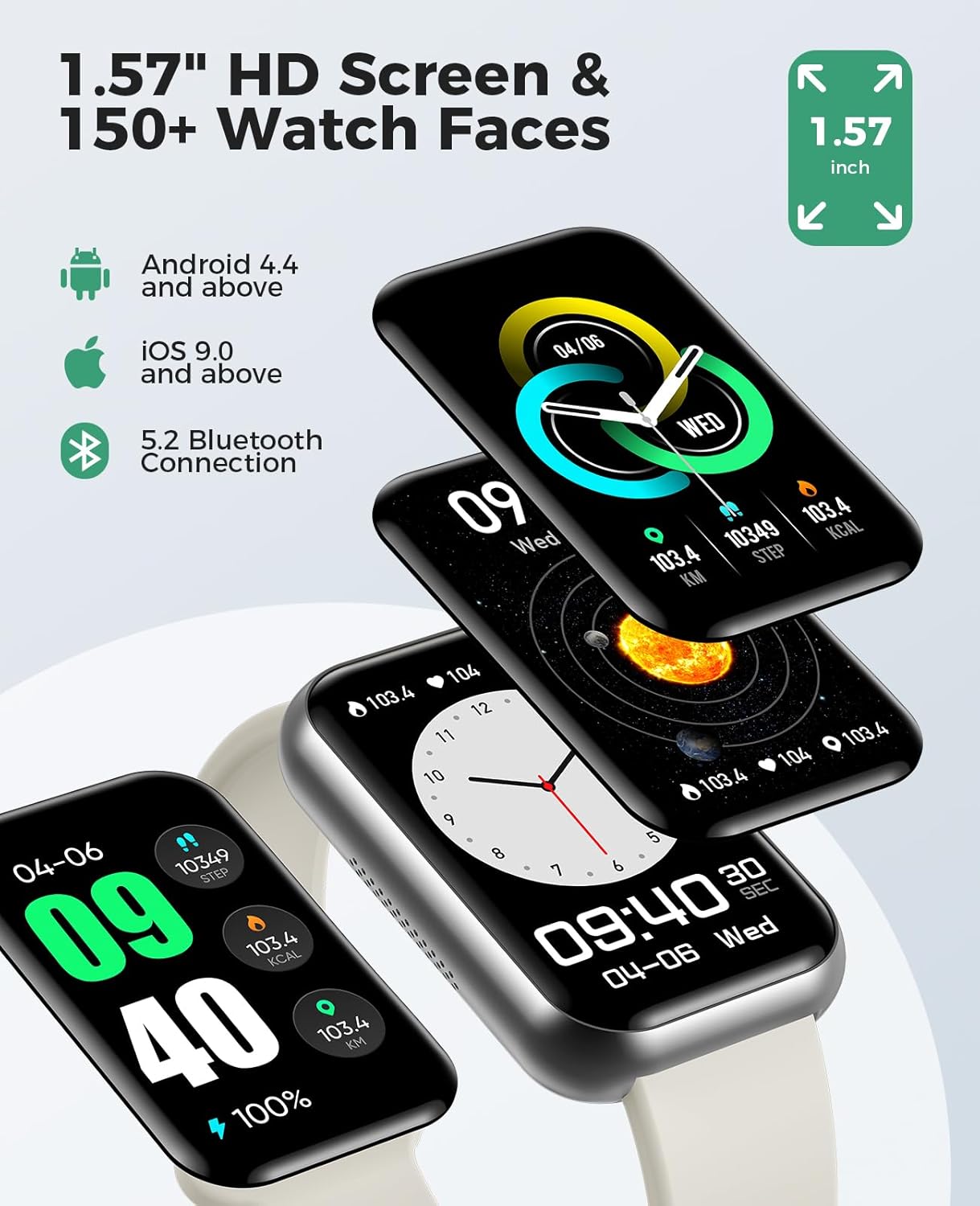 【Superb Visual & Operational Experience】1.57″ fitness watches for women are equipped with the latest ultra hd full touch color screen, delivering exceptional picture quality and highly responsive touch sensitivity, which brings you a unique visual and better interactive experience. Express your unique style with over 150 free watch faces in the App or your favorite photo in your phone album, keep your wrist as dynamic as your lifestyle. Fitness watches for men support iOS 9.0 / Android 4.4 or above smartphones.