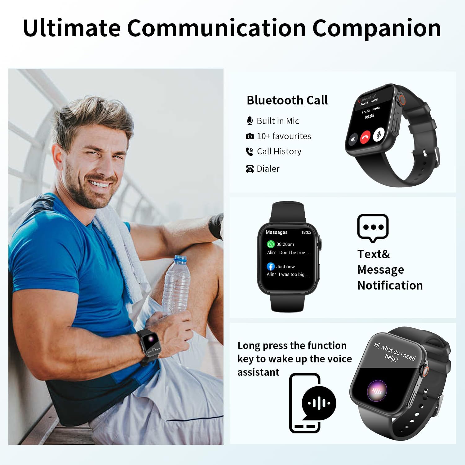 【Bluetooth5.3 Call / Text Message Reminder】 By using advanced Bluetooth technology, you can connect your smartwatch with your mobile phone and enjoy convenient communication functions anytime, anywhere, including answering calls. This feature not only improves work efficiency but also adds more convenience to your daily life. You can receive more application information including Facebook, WhatsApp, Instagram, Twitter and more through the settings.