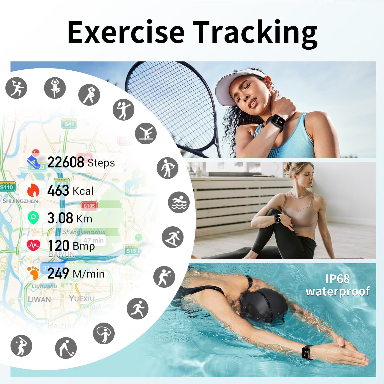 【Multiple Sports Modes and IP68 Waterproof】Activity tracker supports tracking of 116 Exercise Modes. Such as: running, gym exercise, cycling, basketball, football, badminton, yoga, etc. The side function key allows quick access to the sports mode. Link to the GPS on your smartphone to show exercise workout stats like pace, distance and calories plus a map of your workout movement. Make your exercise program more effective. IP68 waterproof allows you to wear it during hand washing.