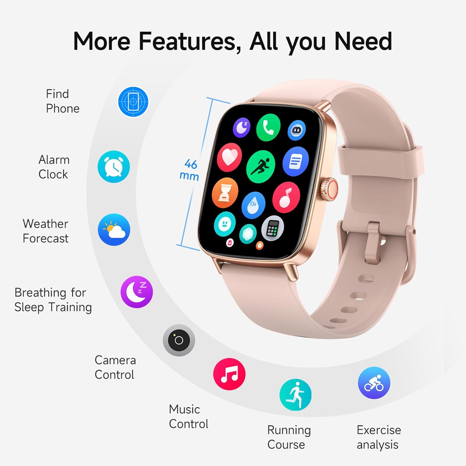 This budget-friendly watch is a great first smartwatch. It offers a wide range of health and fitness apps, including heart rate, sleep, blood oxygen levels, and stress monitoring.The large, vibrant display is easy to read and the watch pairs quickly with the VeryFit app, which is clear and easy to use….and I already have which is a plus.It offers a clear and straightforward tracking system for fitness data, and the watch stays paired reliably. It is similar to others in the same price bracket but performs better than others I have tried, with excellent battery life too – which was pre-charged. The watch and easy to setup using the App (You do need to use it).The watch comes with two straps, one fabric and one plastic, and offers a warranty extension upon registration. (not tried this)The watch certainly has comprehensive features, including the ability to make and receive calls, track various fitness activities, and receive notifications from texts and apps. Also lots of additional watch face designs and customization options in the APP.The watch’s design, the pink and rose gold combination is nice too, and the magnetic charging attachment is easy to use. Overall, the watch is excellent value for its price, a good range of useful features without being overwhelming. Thee hydration reminder is handy, sleep tracking, and the ability to personalize the watch face is appreciated too.Despite some minor drawbacks, such as the need for the app, (you must use it to adjust settings), I think its a great low cost watch