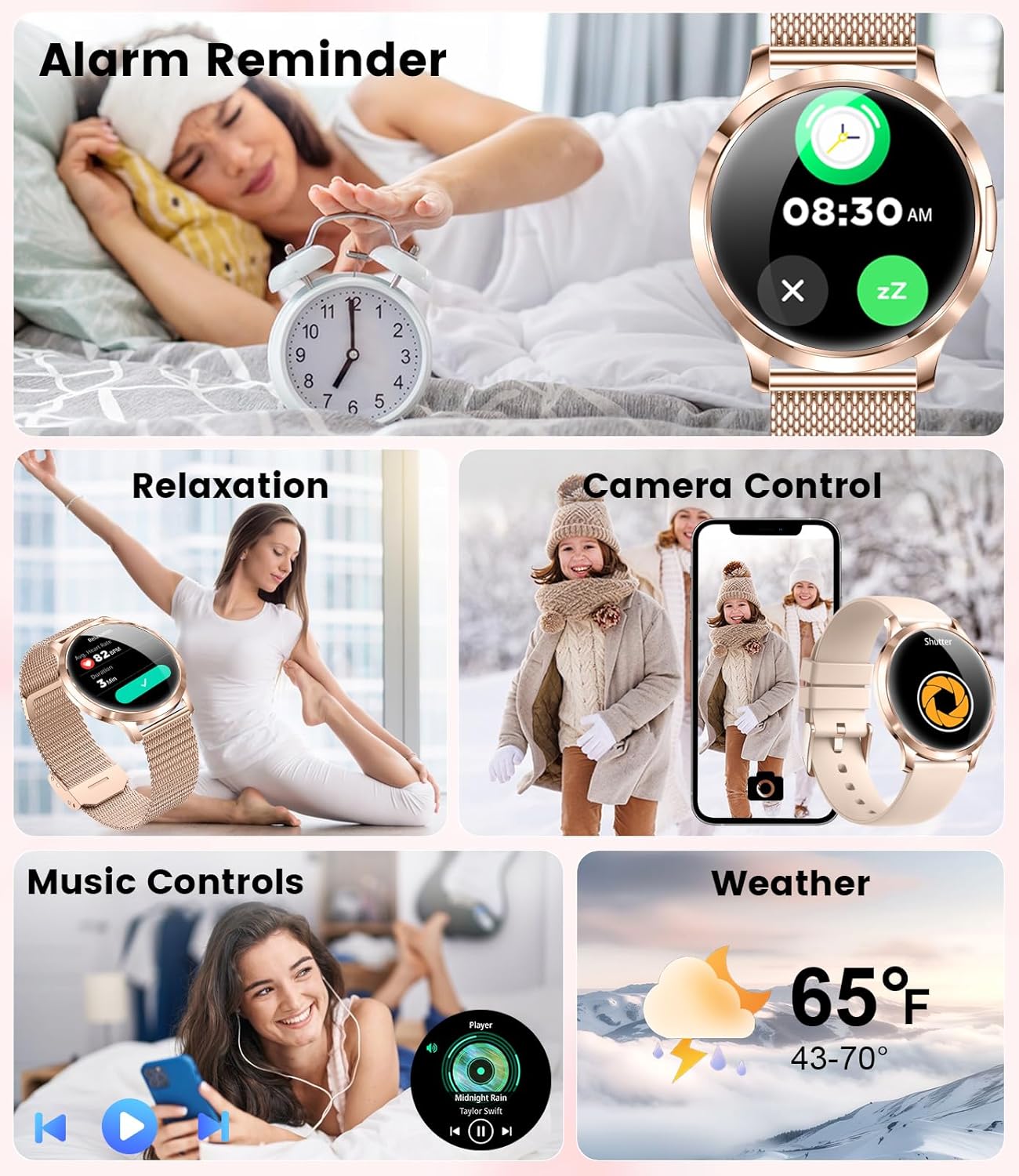 After wearing this smart watch, I can confidently say that this sleek device has become an integral part of my daily routine, though it’s not without its quirks.I was immediately drawn to the watch’s aesthetic appeal. The 1.32″ HD AMOLED display is crisp and vibrant, making it easy to read notifications and track my fitness goals at a glance. What truly sets this smartwatch apart, however, is its versatility in style. The gold bracelet option gives it a sophisticated look that easily transitions from the gym to the office, while the included silicone band is perfect for more intense workouts or casual weekends.The functionality of this smartwatch is impressive. I particularly appreciate the ability to make and answer calls directly from my wrist; it’s been helpful during my busy days when my phone isn’t always within reach. The 5ATM waterproof rating has also proven invaluable, allowing me to wear the watch while swimming or in the shower without worry.With over 100 sports modes, this fitness tracker has encouraged me to diversify my workout routine. From yoga to cycling, it’s been fascinating to see detailed metrics for various activities. The pedometer and calorie tracker have made me more aware of my daily movement, motivating me to take the stairs instead of the elevator more often.However, while the battery life is decent, I find myself needing to charge it every other day with heavy use, which can be inconvenient and some of the more advanced features can be a bit finicky to set up, especially when it comes to syncing with certain apps on my smartphone.I’ve found myself using this smartwatch primarily for fitness tracking and quick communication. It’s become an essential tool for monitoring my workouts, ensuring I’m hitting my step goals, and staying connected without constantly reaching for my phone. During busy days, the ability to glance at my wrist for important notifications has been a real time saver.This Smart Watch for Women has proven to be a versatile and stylish addition to my tech arsenal. Its combination of fashion forward design and robust features makes it a solid choice for women looking to stay connected and health conscious without sacrificing style. Whether I’m in a meeting or on a run, this smartwatch has become my constant companion, keeping me on track and looking good while doing it.