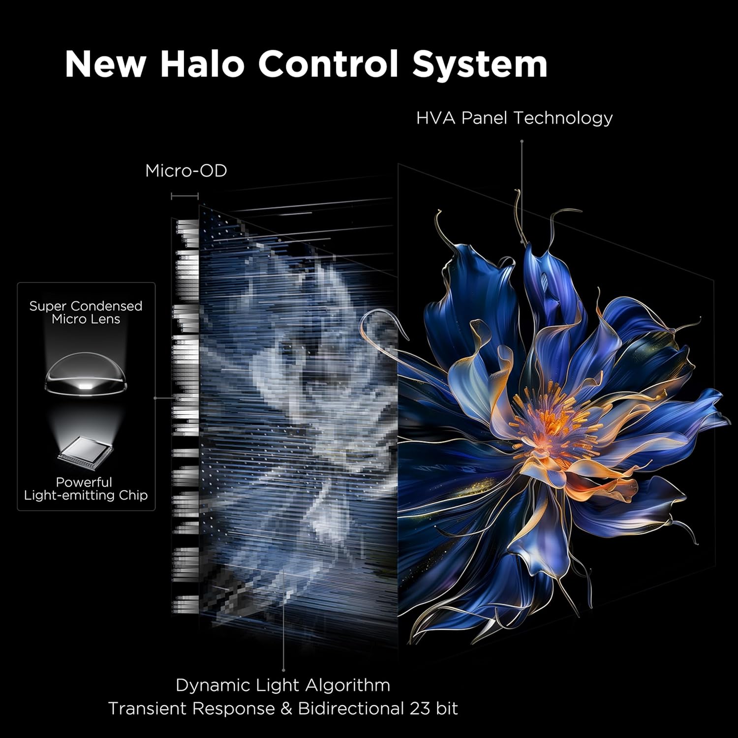 TCL Halo Control System: An advanced Technology Suite that includes the New Super High Energy LED Microchip, Super Condensed Micro Lens, Micro-OD Reduced Optical Distance, High Contrast HVA Panel, Enhanced QLED, Zero Delay Transient Response, Bi-direction 23-bit Backlight Controller, and Dynamic Light Algorithm for Stunning “Halo-Free” Images.