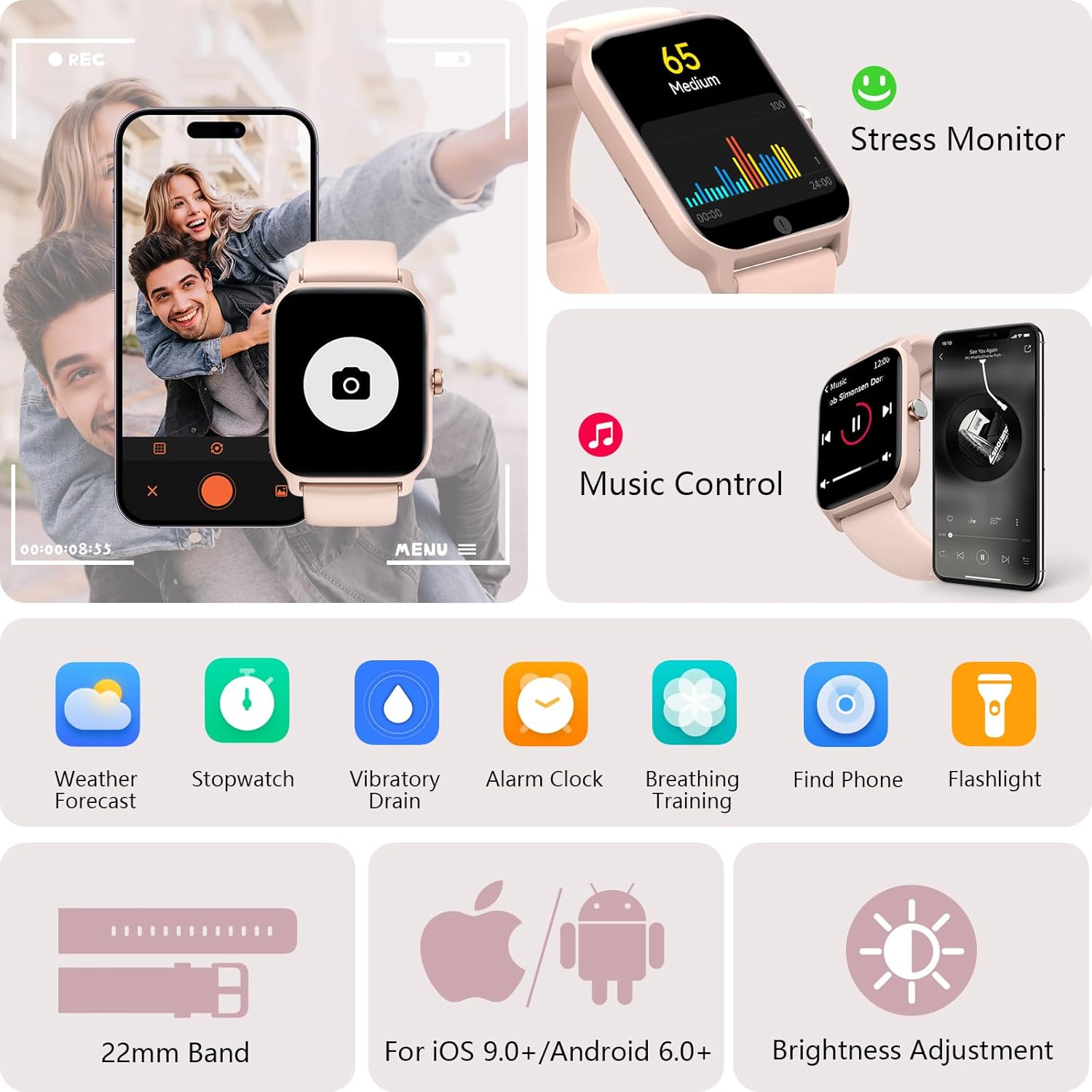 J’ai pris cette montre pour ma femme, qui souhaitait depuis longtemps passer à une montre connectée !Au déballage, je constate que l’aspect de la montre est très sympa : j’avais peur que le rose soit trop prononcé, mais ici, c’est davantage une couleur chair, ce qui la rend féminine tout en étant discrète, et lui donne un très bel aspect au poignet !Le bracelet est en silicone soft-touch, très agréable au toucher autant que porté, il ne glisse pas et permet à la montre de rester bien en place, sans pour autant être douloureux en fin de journée.La fonctionnement de la montre est enfantin, et même une personne qui n’est pas une technophile avertie peut s’en sortir sans problème : l’interface est didactique, et la montre va à l’essentiel (dans le bon sens du terme !).L’écran est lumineux, et parfaitement lisible, même en extérieur, et le combo tactile/interface est rapide et réactif : cela rend la montre plaisante à l’usage.Elle est bien évidemment dotée de toutes les fonctionnalités que l’on peut attendre d’une montre connectée :- Réception des messages et notifications- Appels téléphoniques- Tracking d’activités sportives- Personnalisation des cadrans- Déclenchement à distance de l’appareil photo du téléphone- Capteurs de santé (cardique, suivi du sommeil…)- Contrôle de la musiqueElle contient même des mini-jeux : tout cela pour dire qu’elle propose tout le nécessaire !Sa compatibilité Android et iOs est avérée car j’ai pu la tester sur deux téléphones différents : à chaque fois l’appairage se fait sans encombre, le bluetooth est stable et je n’ai à déplorer aucune perte de connexion.Concernant l’autonomie, elle tient facilement une semaine en utilisation normale/modérée avant de nécessité une charge (qui se fait par le biais d’un câble magnétique, fourni).C’est un modèle assez commun, tant dans son design que dans ses fonctions, et je trouve par contre le tarif un peu élevé (environ 80 euros au moment ou j’écris ce commentaire). Une montre de cette gamme trouverait mieux sa place à moins de 60 euros, et c’est la raison pour laquelle j’ai retiré une étoile.Sorti de ce constat : si elle vous plait et que cela ne vous dérange pas de mettre un peu plus car vous avez “flashé”, dans ce cas je trouve que c’est un bon choix, car elle est complète et que ses fonctions marchent sans accroc !