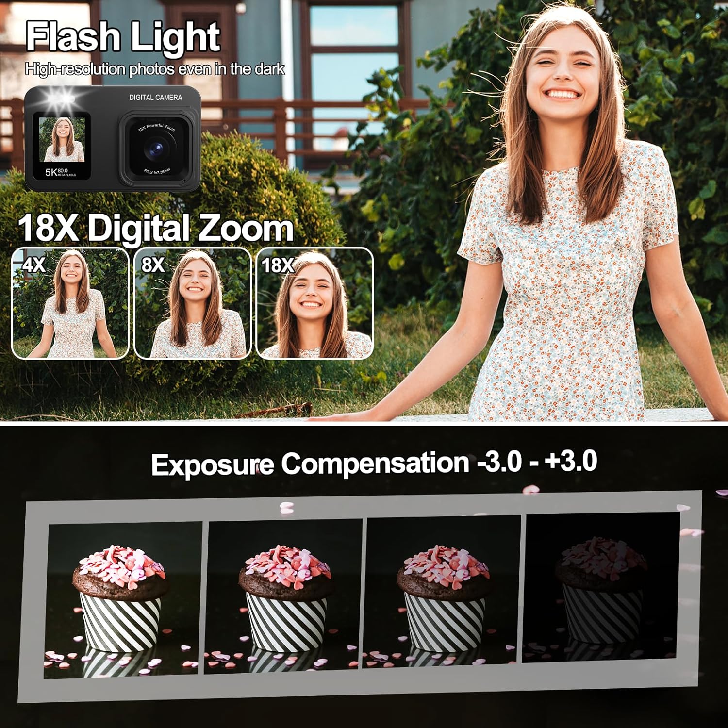 Upgraded 5K Dual Screen Digital Camera,80MP Vlog Photography Camera for YouTube,Campus,Travel,Compact Point & Shoot Camera for Teens & Beginners with Autofocus,18x Zoom,Anti-Shake,Black