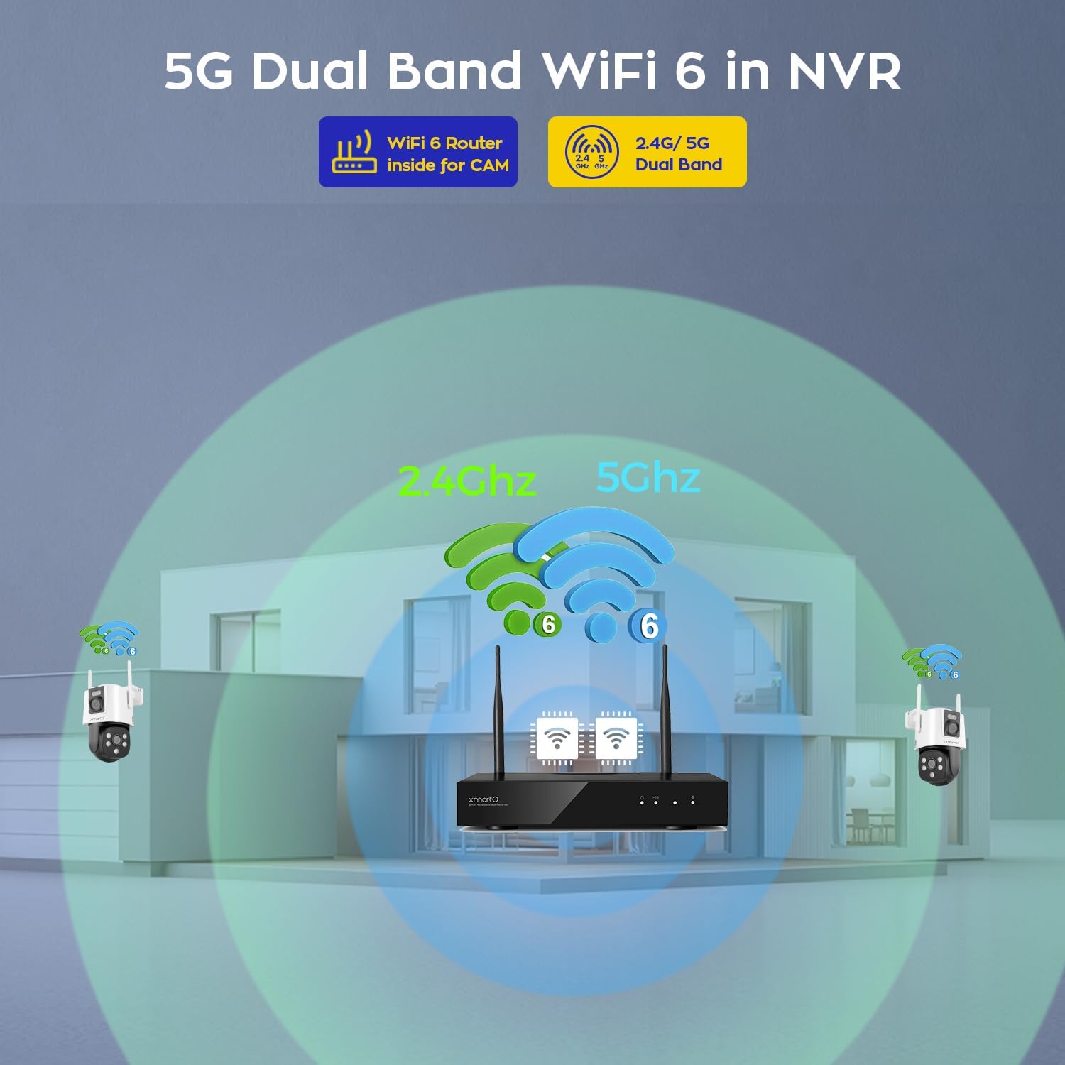 【Long Range WiFi 6 for Easy Installation】Evolved to latest WiFi 6 technology, on open ground the XMARTO WiFi cameras can be installed up to 1300ft (400m) away from the NVR. In actual houses with walls & interferences, you can still mount the cameras a few hundred feet away. This makes it possible to use the cameras wirelessly and