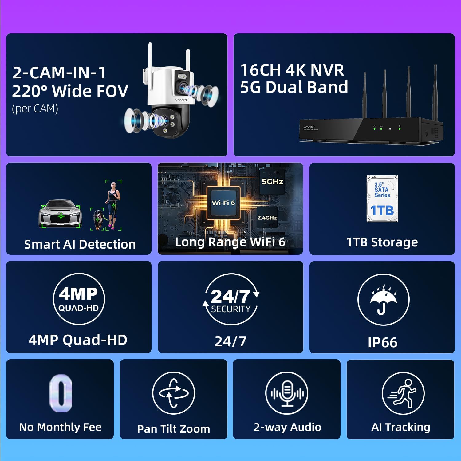 xmartO [Dual-Image Wide FOV] 16CH Security Camera System Wireless, 4-Set 2-in-1 Cameras, 4K Long Range WiFi 6 Surveillance NVR, Pan Tilt Zoom 4MP QHD Home CCTV Camera Set w. 1TB HDD, 0 Monthly Fee
