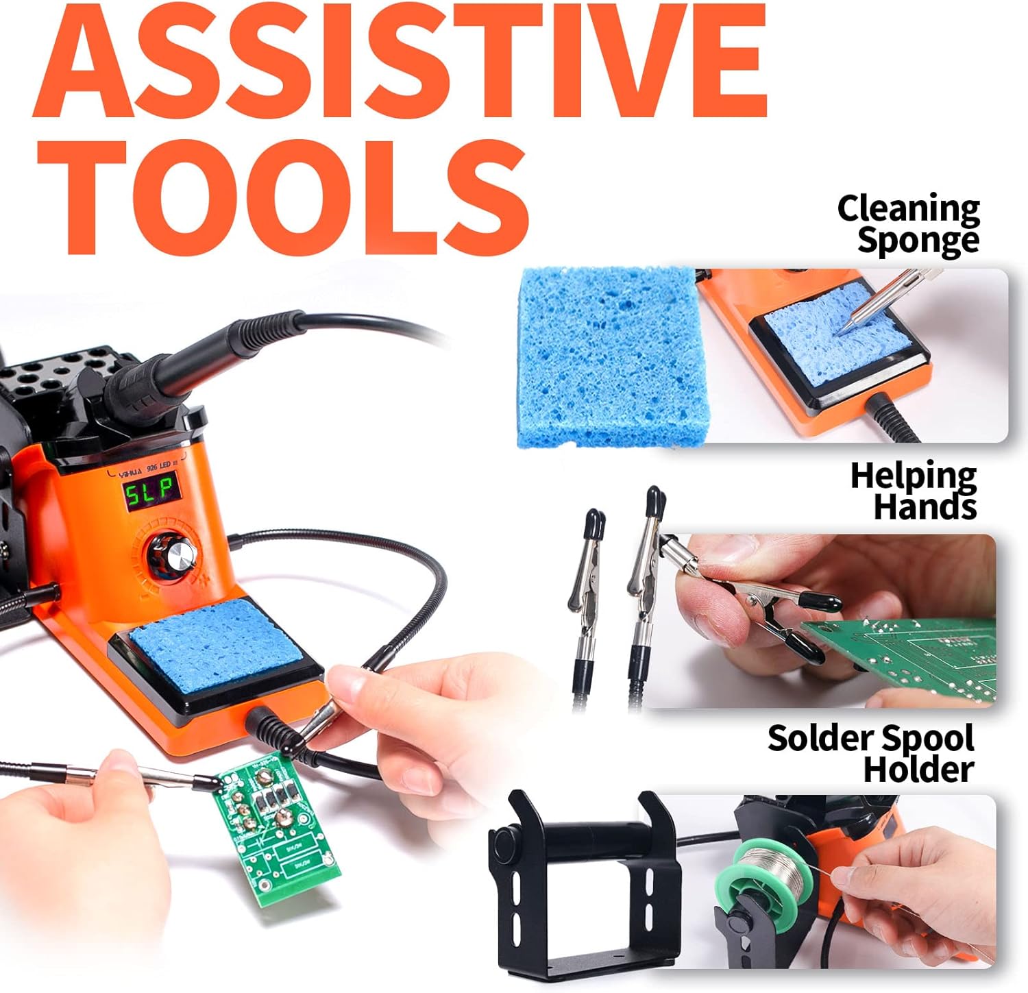 YIHUA 926 III 60W LED Display Soldering Iron Station Kit w 2 Helping Hands, 6 Extra Iron Tips, Roll of Lead-Free Solder, Solder Sucker, S/S Tweezers, °C/ºF Conversion, Auto Sleep & Calibration Support