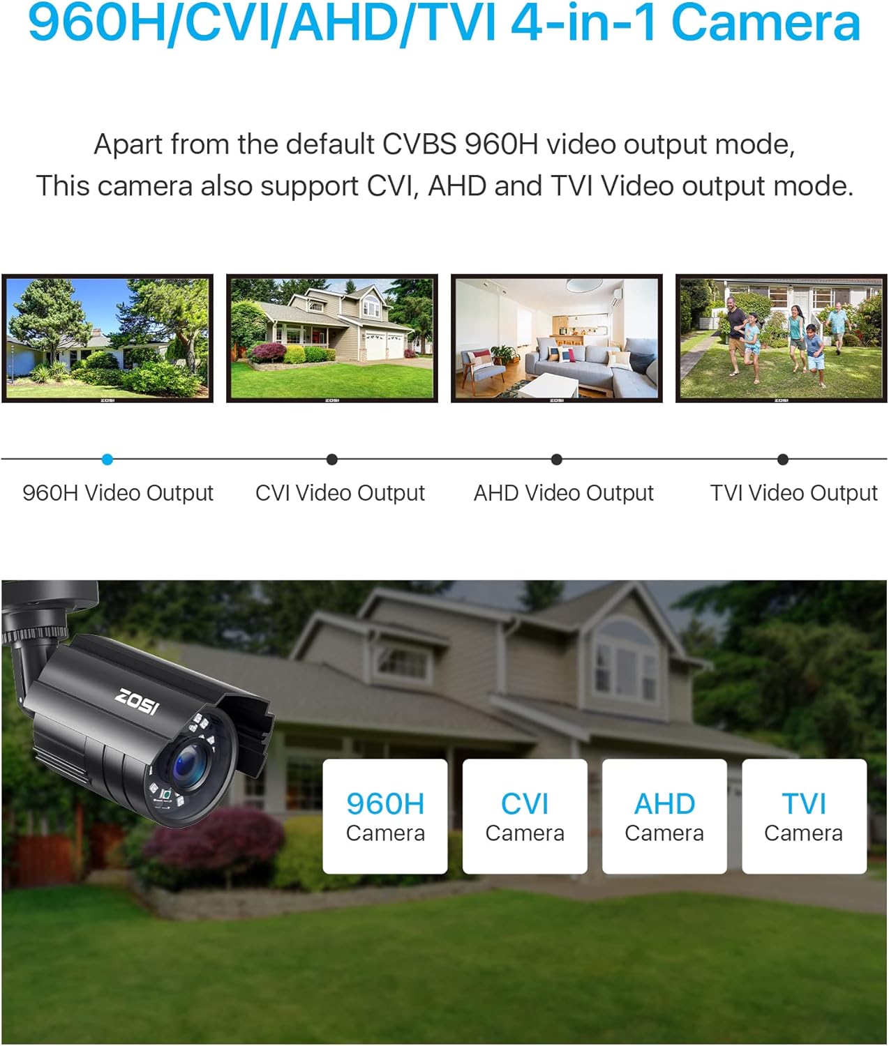 【2MP HD 1080P 4-IN-1 Security Camera】This is 4-in-1 TVI/CVI/AHD/CVBS bullet camera. It is compatible with 960H,720P,1080P,3MP,5MP,8MP,4K HD-TVI, AHD, CVI, and CVBS/960H analog DVRs.