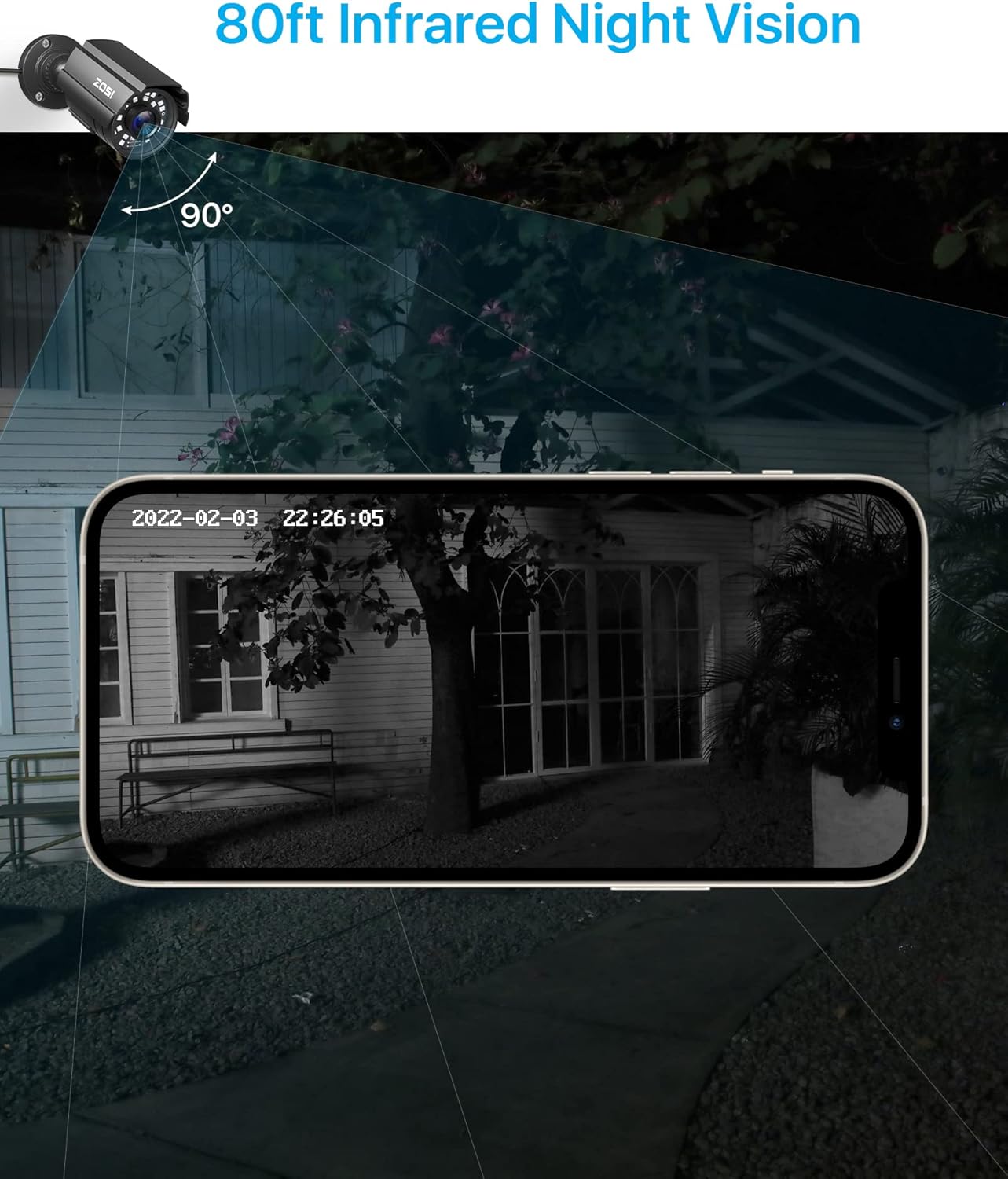 【80ft Night Vision】 Built in 24pcs IR LEDs, Get a sharp and crisp image day or night with the camera’s automatic IR-CUT filter. Up to 80ft night vision in total darkness and 120ft Night vision in ambient light. More than 3.0Lux the night vision is color.